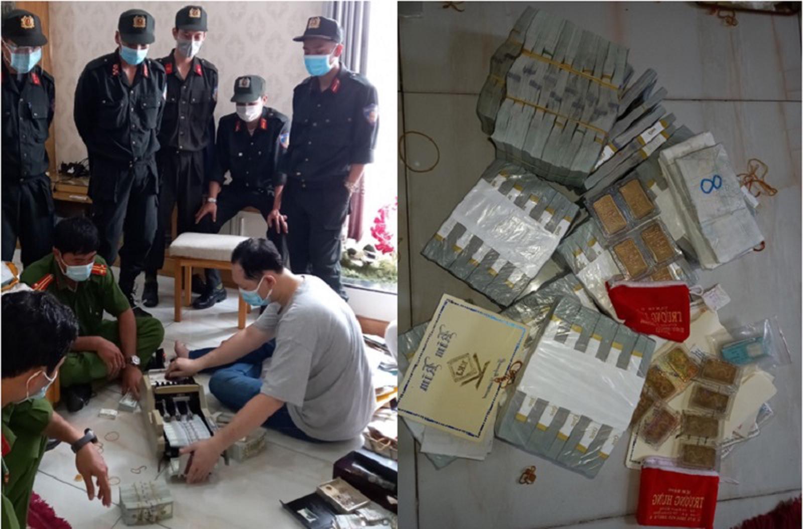 Qua khám xét các địa điểm, lực lượng chức năng thu giữ được khoảng 36kg vàng, 1,27 triệu USD, hơn 1,7 tỷ đồng… Ảnh: CAAG