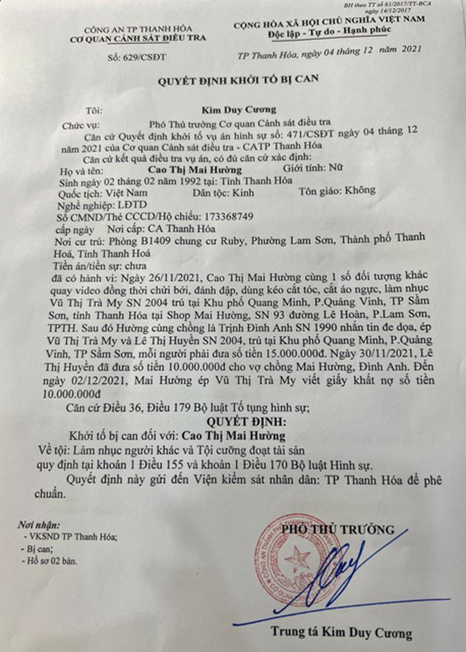 Cơ quan CSĐT Công an TP Thanh Hóa đã ra quyết định khởi tố bị can đối với Cao Thị Mai Hường (SN 1992) trú tại phường Lam Sơn, TP Thanh Hóa về tội làm nhục người khác; cưỡng đoạt tài sản. Đồng thời, cơ quan chức năng cũng khởi tố bị can và bắt tạm giam đối với Trịnh Đình Anh (SN 1990 là chồng của Hường) về tội cưỡng đoạt tài sản.
