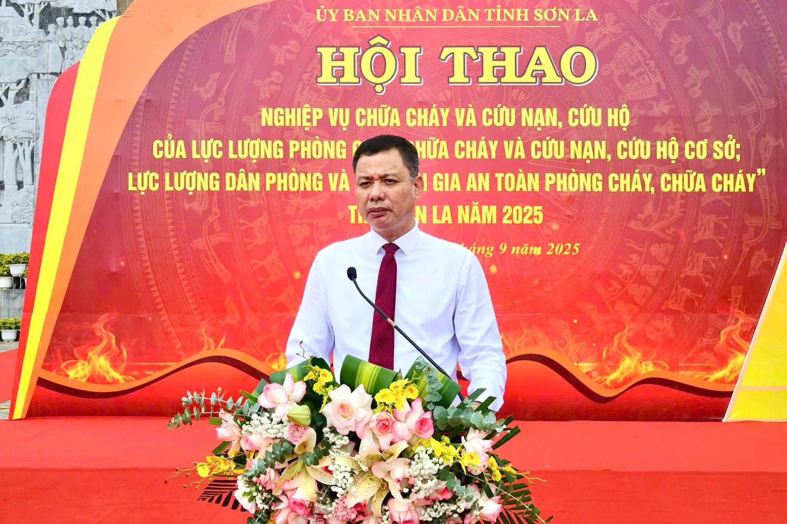 Chủ tịch UBND tỉnh, Phó trưởng Ban chỉ đạo PCCC và CNCH tỉnh Sơn La Nguyễn Thành Công phát biểu tại hội thao. Ảnh: ND