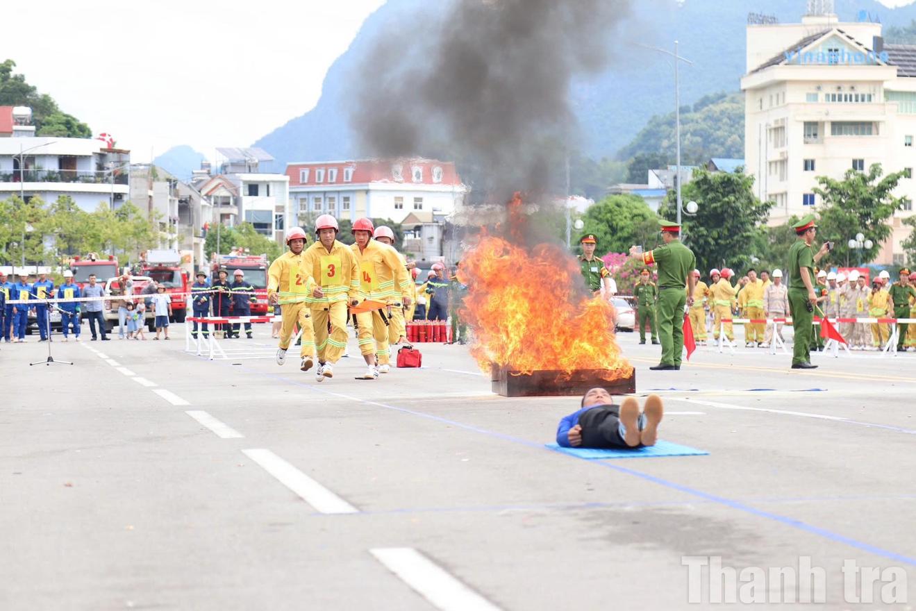 Tại hội thao, các đại biểu và quần chúng nhân dân cũng được tham quan lực lượng Cảnh sát PCCC và CNCH - Công an tỉnh Sơn La thao diễn triển khai đội hình chữa cháy và cứu nạn, cứu hộ cơ bản với tình huống giả định cháy xảy ra tại 1 hộ gia đình (hoặc cơ sở) có người bị mắc kẹt trong đám cháy.