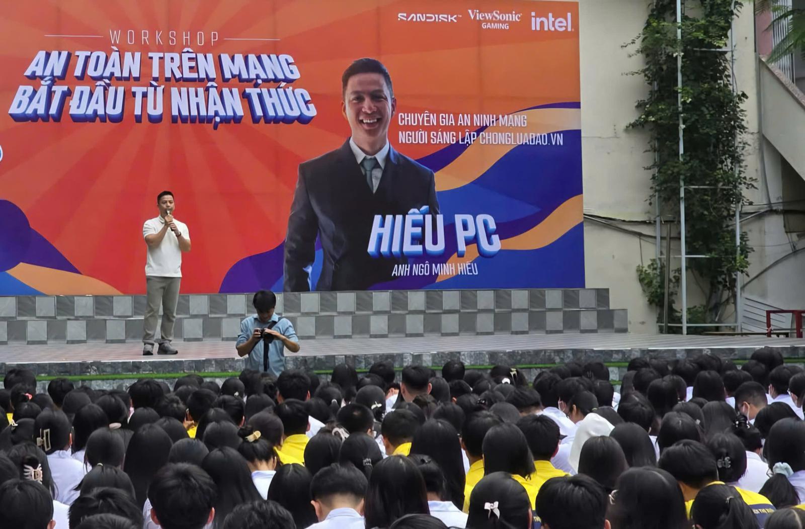 Chuyên gia an ninh mạng Ngô Minh Hiếu (Hiếu PC) chia sẻ với gần 2.000 học sinh tại Trường THPT Bùi Thị Xuân, TP Hồ Chí Minh về an toàn trên không gian mạng. Ảnh: NVCC