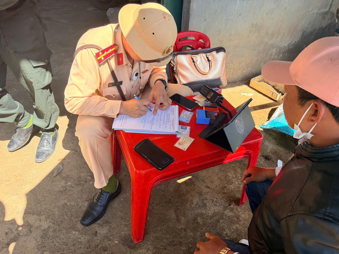 Trạm Cảnh sát giao thông Mađaguôi, thuộc Phòng Cảnh sát giao thông, Công an tỉnh Lâm Đồng xử lý trường hợp vi phạm giao thông. Ảnh: CTV