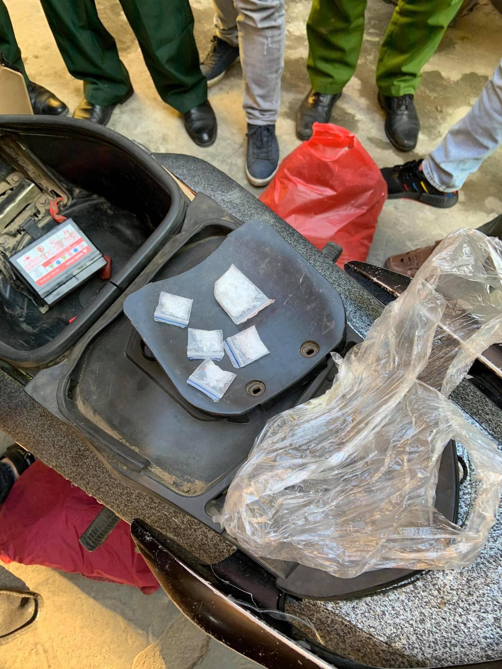 Kiểm tra trên xe của đối tượng Trung đã phát hiện dưới miếng lót cao su để chân bên phải có 1 gói nilon chứa nhiều tinh thể màu trắng; trong khu vực chứa bình ắc quy có 1 túi nilon chứa 5 túi nhỏ.