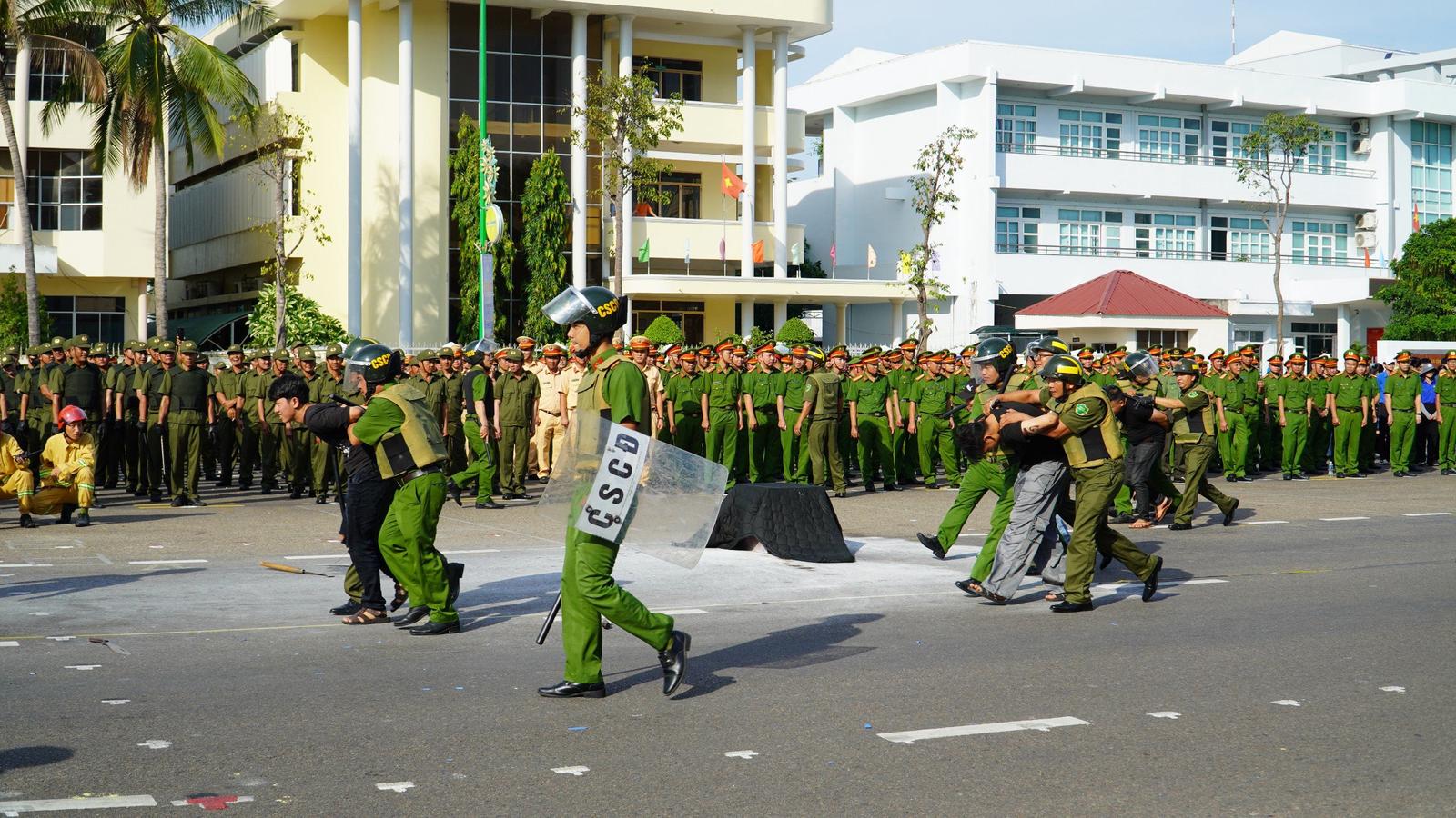 Diễn tập phương án khi đối tượng quá khích sử dụng hung khí tại buổi lễ. Ảnh: Khoa Lê