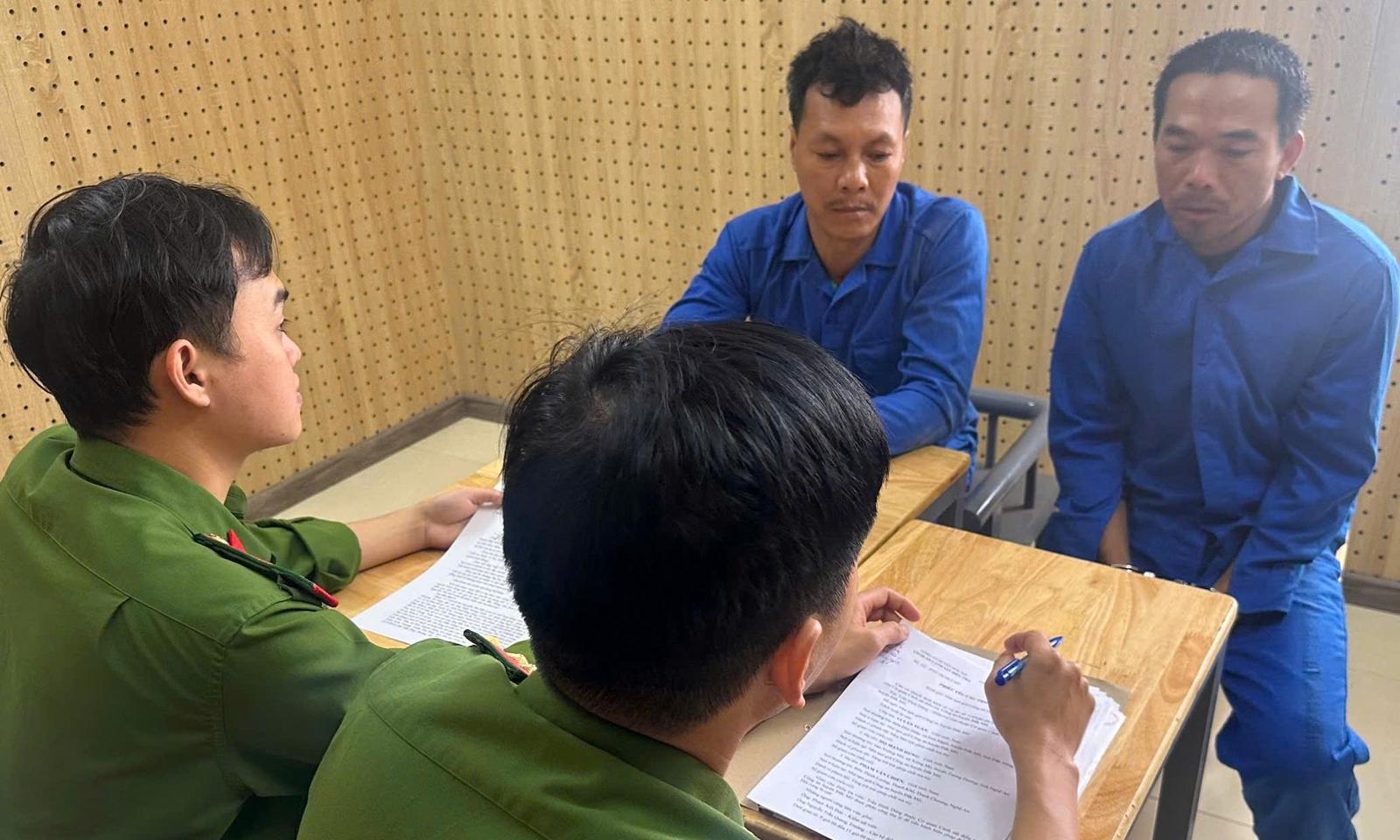 Các đối tượng vận chuyển hàng cấm, pháo nổ tại Cơ quan điều tra. Ảnh: CA cung cấp