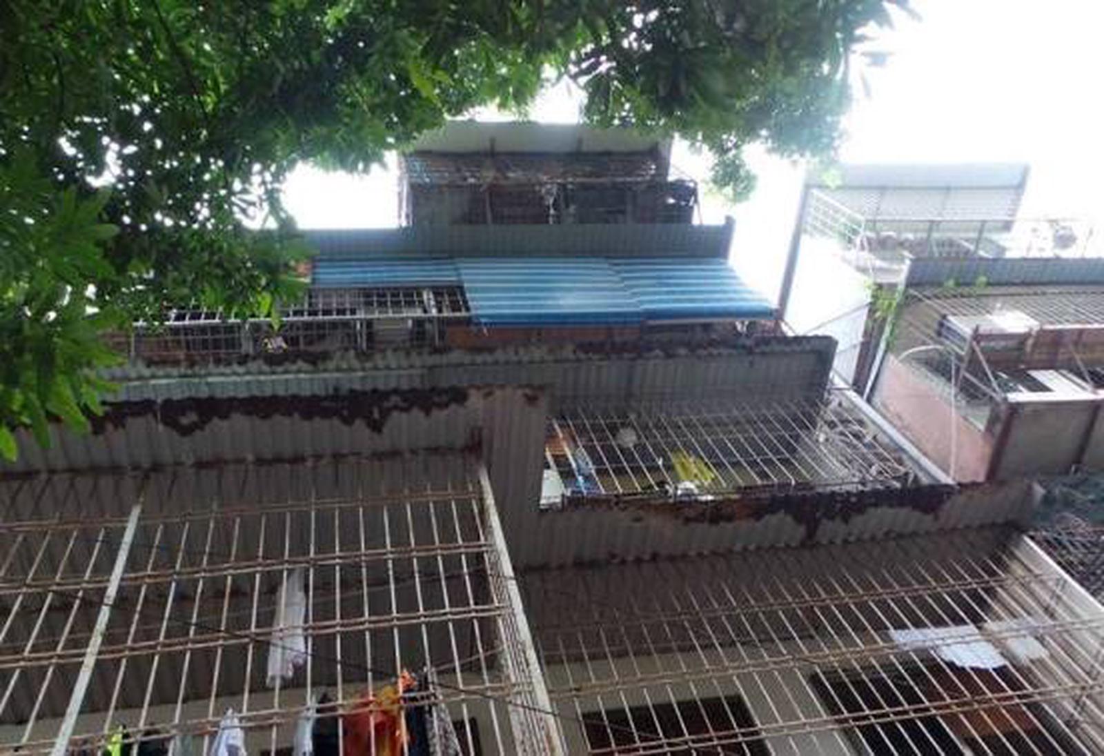 Căn hộ trên tầng 4 có rèm che nắng màu xanh nơi đối tượng khống chế con tin