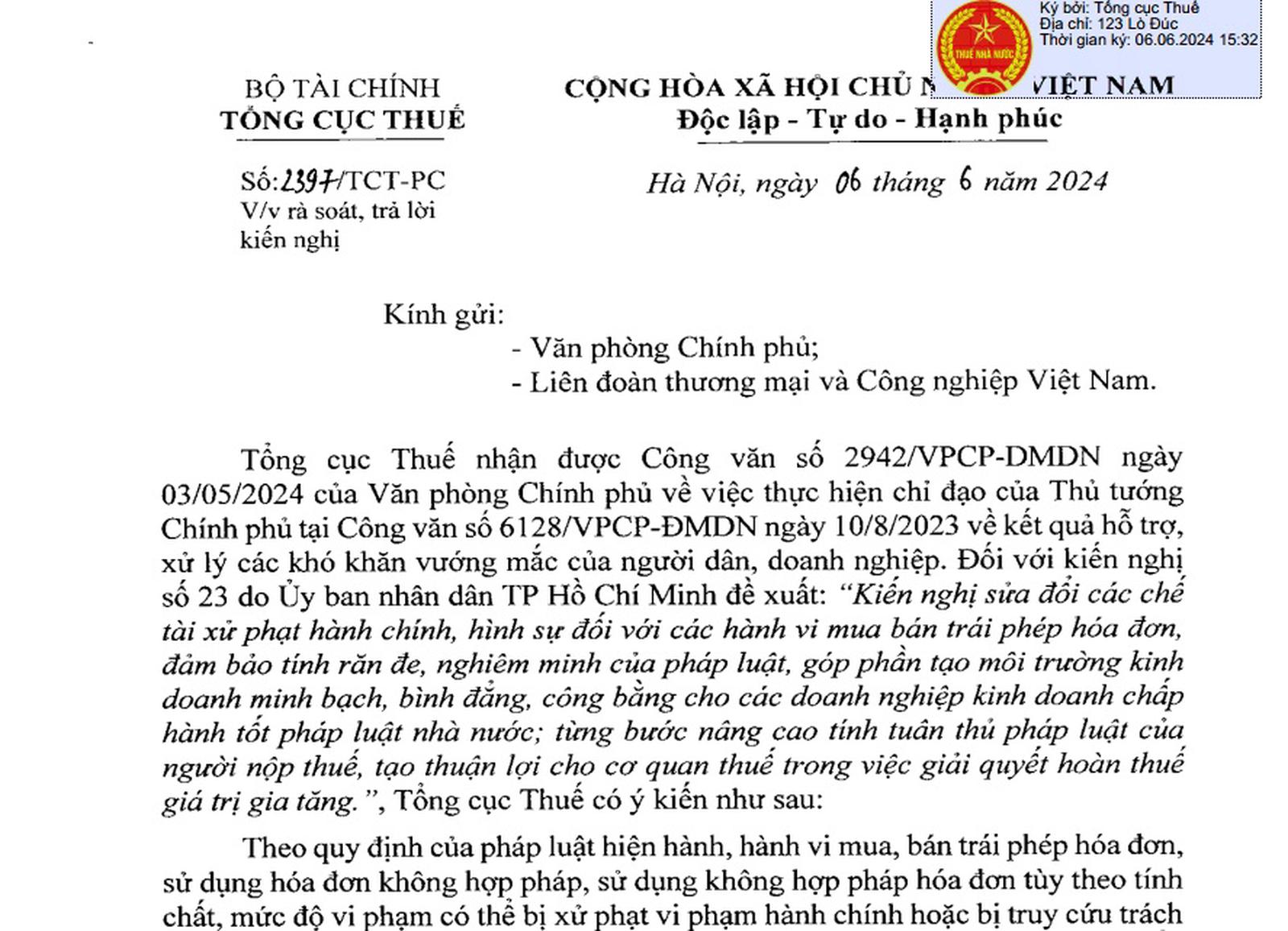 Văn bản số 2397/TCT-PC của Tổng cục Thuế về việc rà soát, trả lời kiến nghị, gửi Văn phòng Chính phủ và Liên đoàn Thương mại và Công nghiệp Việt Nam. Ảnh: HA