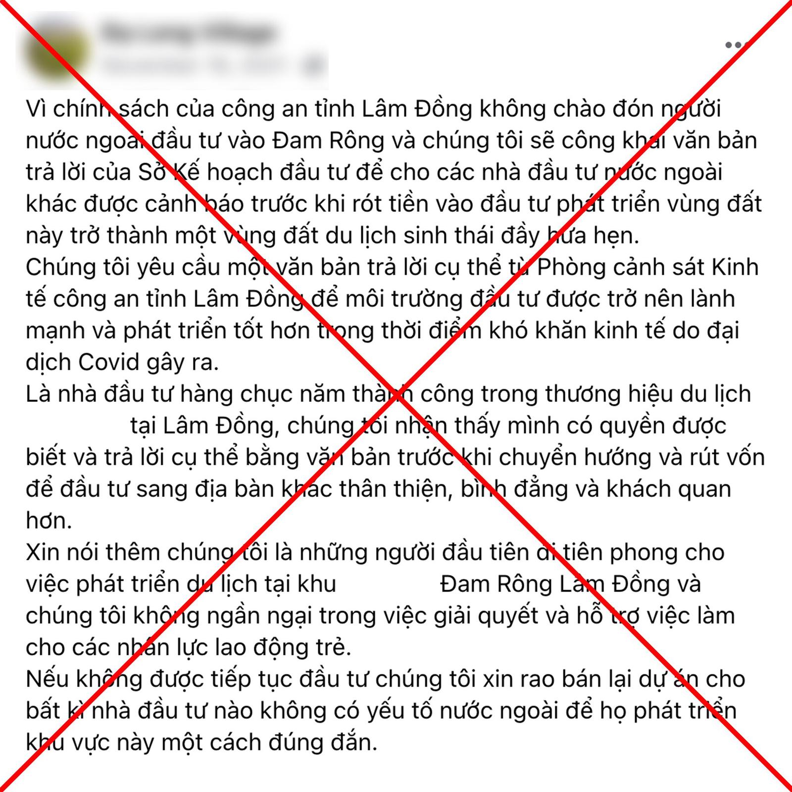 Trước đó, qua công tác bảo đảm an ninh mạng, Cơ quan Công an phát hiện fanpage “Đ.L.V” đăng tải bài viết cho rằng “chính sách của Công an tỉnh Lâm Đồng không chào đón người nước ngoài đầu tư vào Đam Rông” và đưa ra yêu cầu “một văn bản trả lời cụ thể từ Phòng Cảnh sát kinh tế Công an tỉnh Lâm Đồng để môi trường đầu tư được trở nên lành mạnh và phát triển tốt hơn trong thời điểm khó khăn kinh tế do đại dịch Covid gây ra”, đồng thời “cảnh báo cho các nhà đầu tư nước ngoài khác trước khi rót tiền vào đầu tư du lịch”