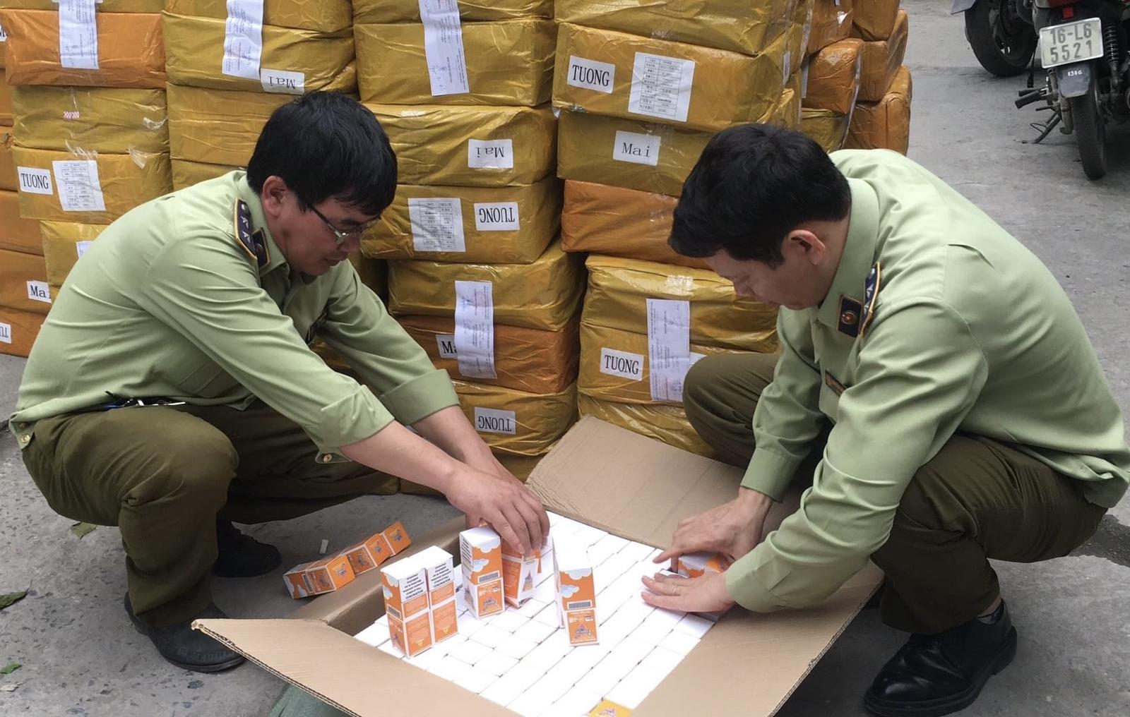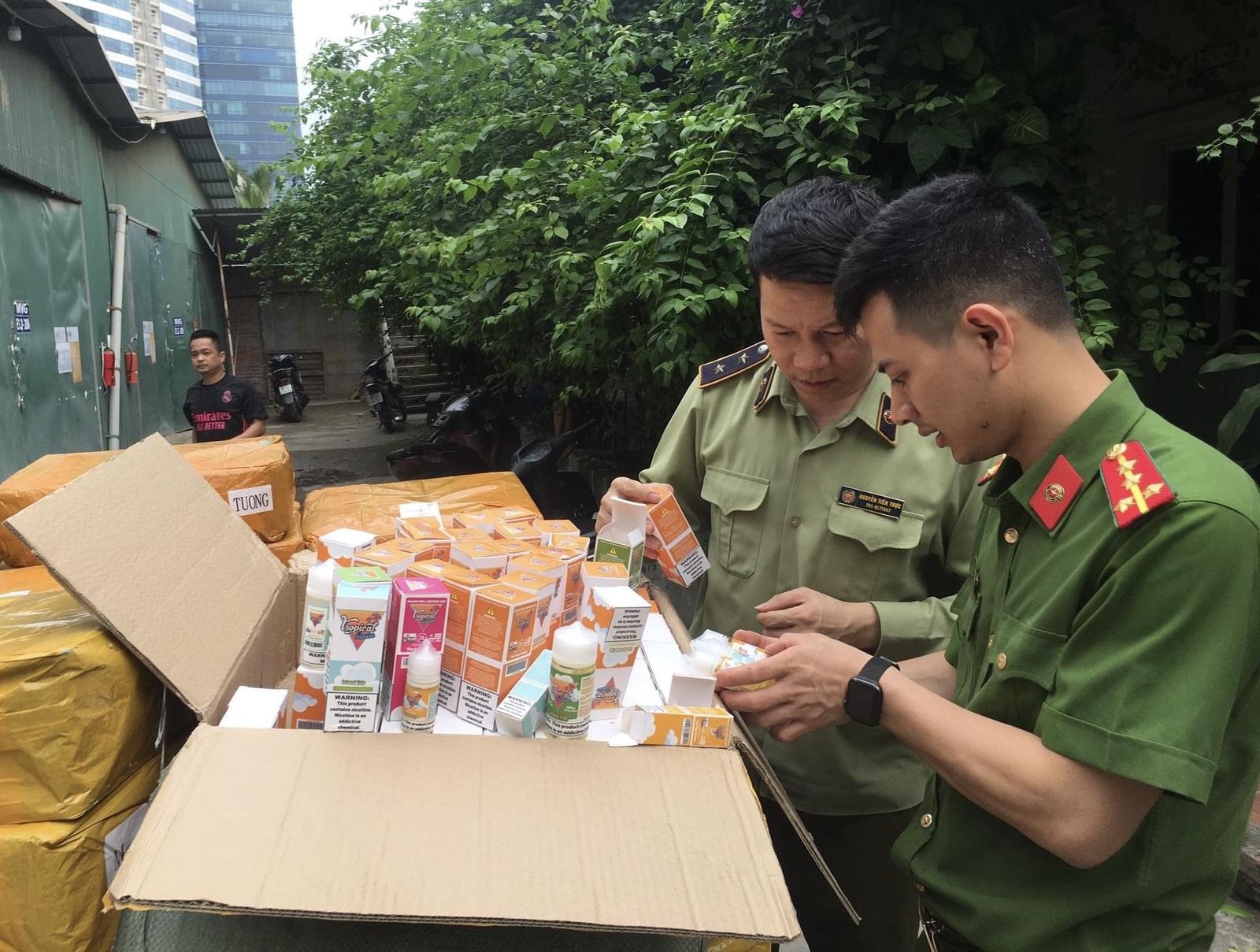 Lực lượng chức năng đang kiểm kê lô hàng tinh dầu thuốc lá điện tử vừa phát hiện trên đường Phạm Hùng. Ảnh: MK