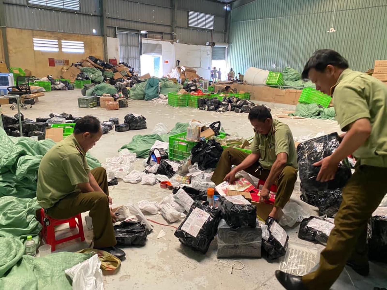 Vẫn còn hàng nghìn sản phẩm tại kho của Cơ sở Kinh doanh chuyển phát nhanh Thuận Phong đang được lực lượng QLTT tiếp tục kiểm đếm và phân loại. Ảnh: MK