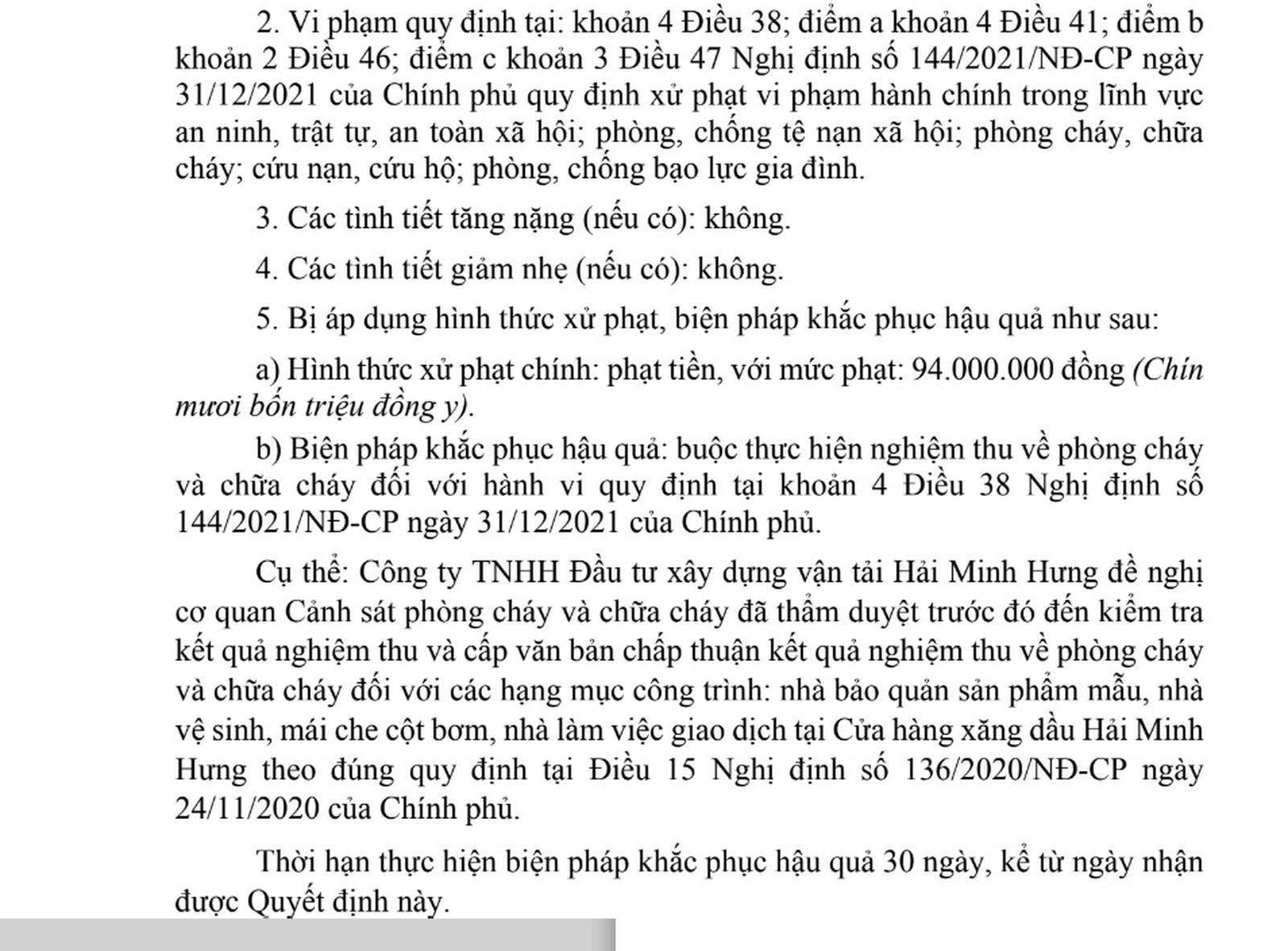 Theo cơ quan có thẩm quyền, Công ty TNHH Đầu tư xây dựng vận tải Hải Minh Hưng đã thực hiện hành vi vi phạm hành chính khi đưa các hạng mục công trình: Nhà bảo quản sản phẩm mẫu, nhà vệ sinh, mái che cột bơm, nhà làm việc giao dịch tại cửa hàng xăng dầu Hải Minh Hưng vào sử dụng, hoạt động khi chưa có văn bản chấp thuận kết quả nghiệm thu về phòng cháy và chữa cháy của cơ quan công an có thẩm quyền.