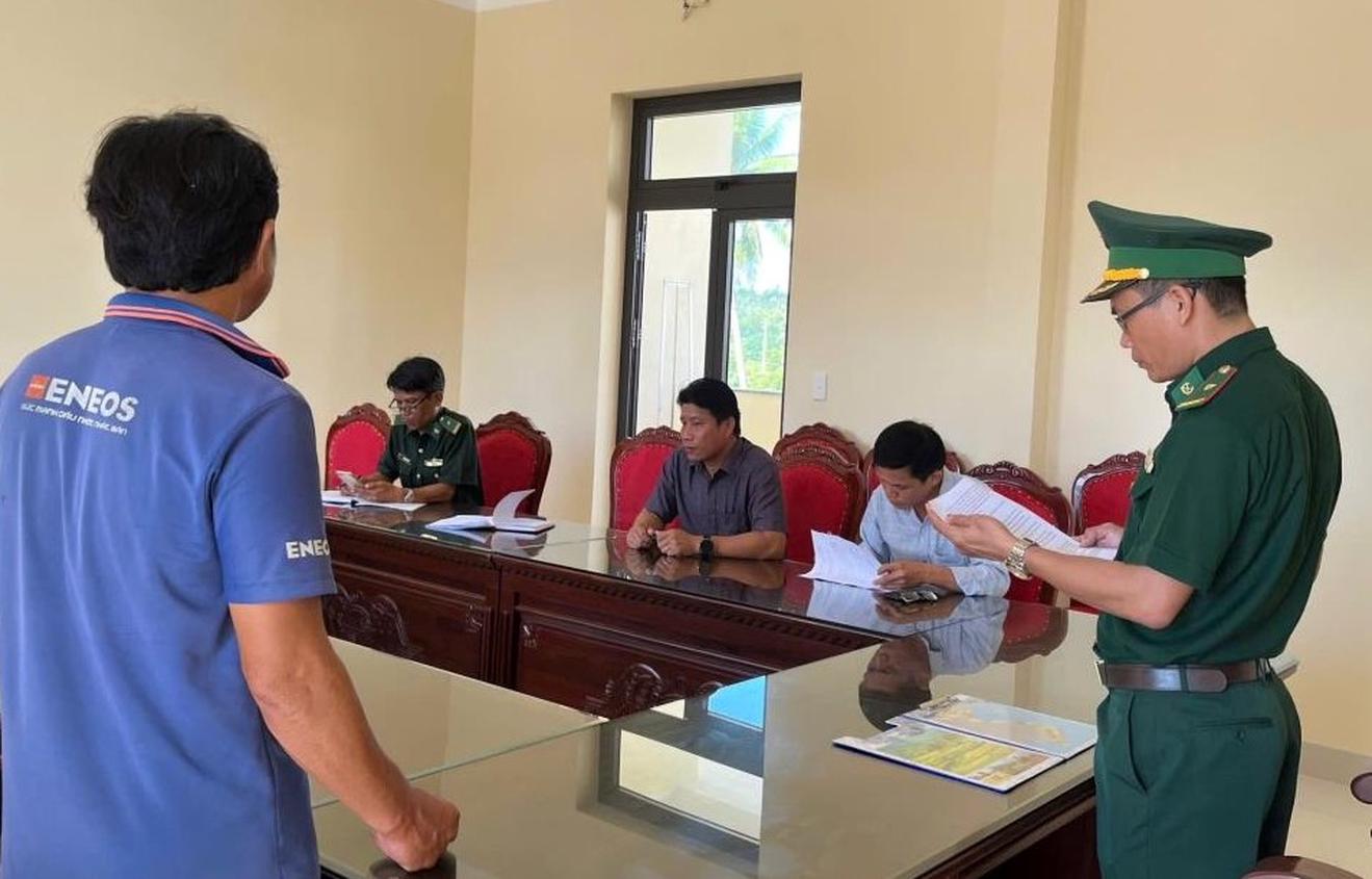 Cán bộ Đồn Biên phòng cửa khẩu cảng Sa Kỳ công bố quyết định xử phạt vi phạm hành chính đối với thuyền trưởng tàu cá QNg 91369TS. Ảnh: T.Đ