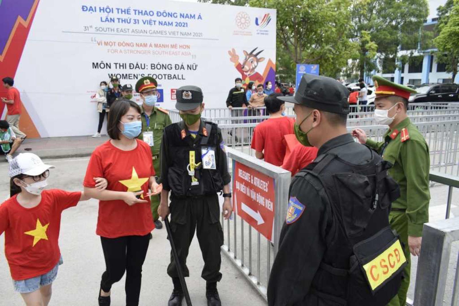 Lực lượng công an kiểm soát chặt chẽ khán giả vào sân cổ vũ trận chung kết bóng đá nữ trên Sân vận động Cẩm Phả. Ảnh: Minh Châu