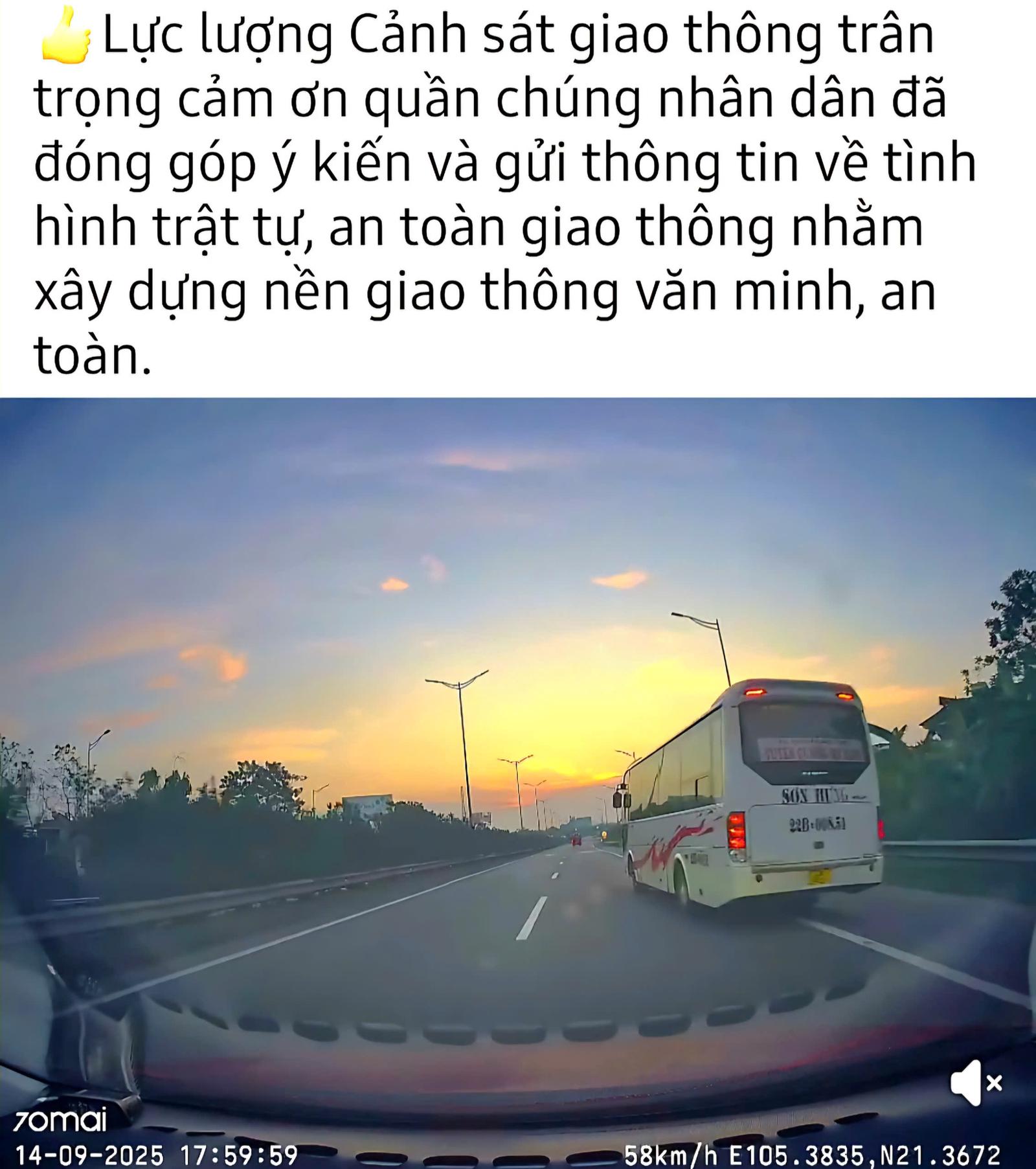 Hình ảnh xe khách chạy ở làn dừng khẩn cấp trên cao tốc bị phạt 5 triệu đồng, trừ 2 điểm giấy phép lái xe, sau khi người dân phản ánh. Ảnh: CSGT