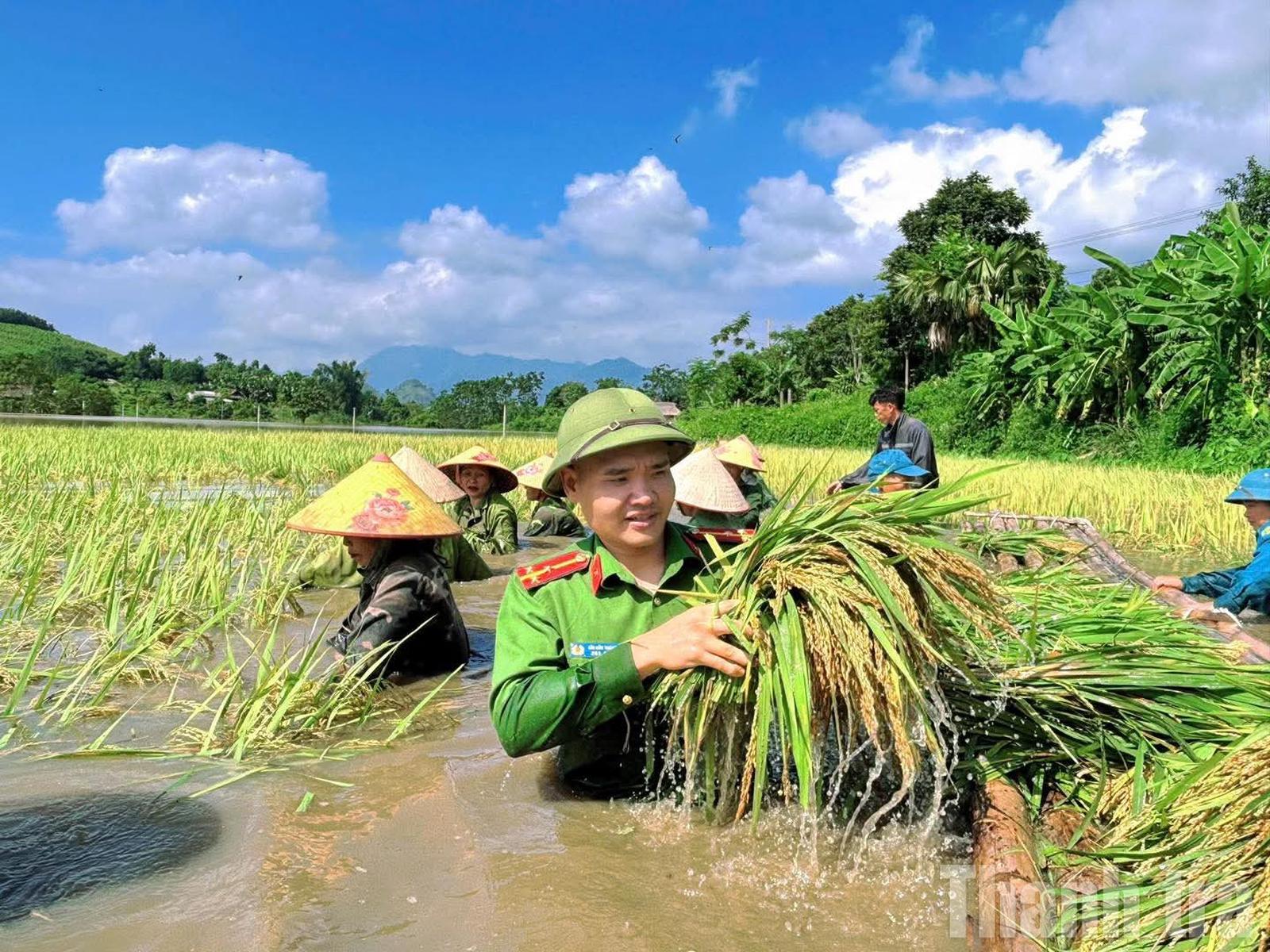 Lực lượng Công an tỉnh Tuyên Quang giúp người dân gặt lúa tránh lũ. Ảnh: ND