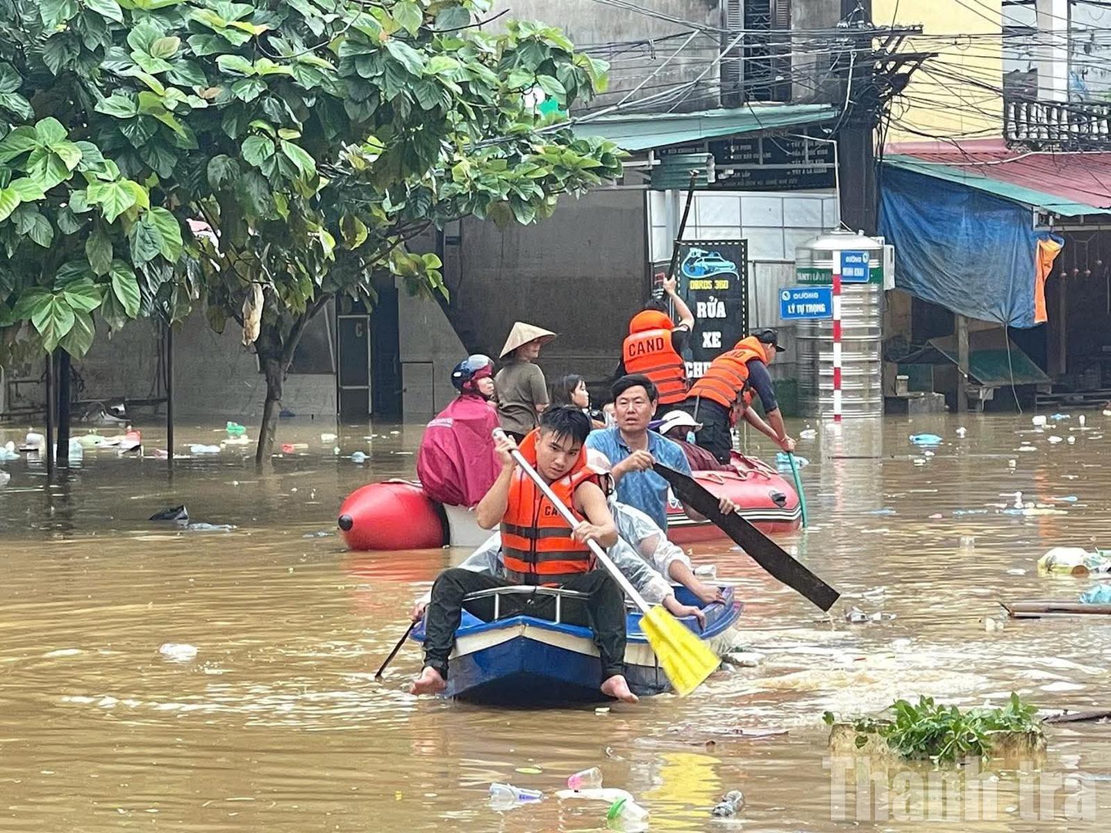 Trong mưa lũ nguy hiểm, lực lượng Công an tỉnh Tuyên Quang bất chấp hiểm nguy luôn xung phong tuyến đầu để bảo vệ tính mạng và tài sản cho Nhân dân. Ảnh: ND