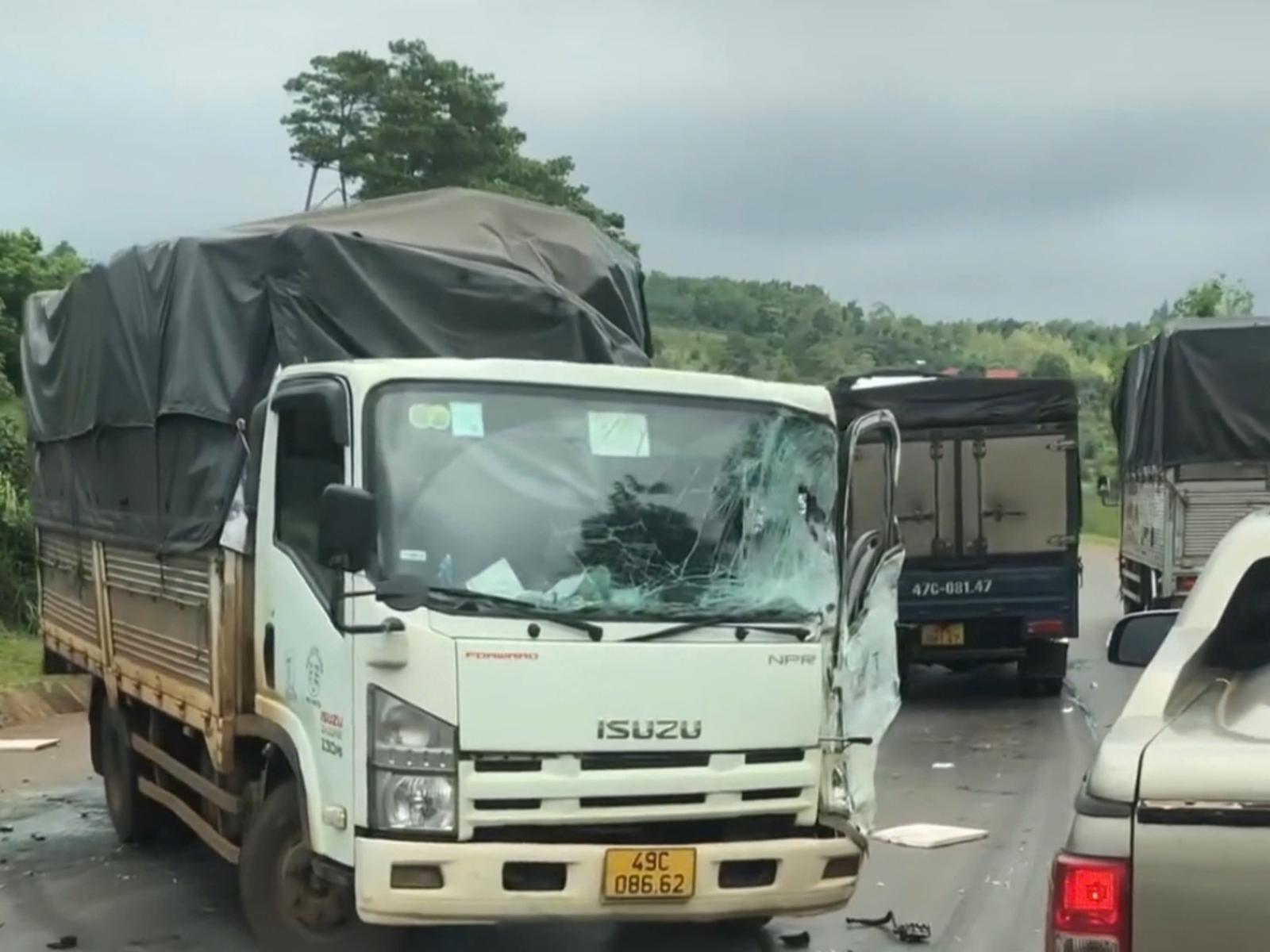 Trong đó, xe tải 49C.086.62 bị hư hỏng nặng phần đầu và thùng xe, xe tải 47C-372.12 rớt xuống mương thoát nước bên đường.