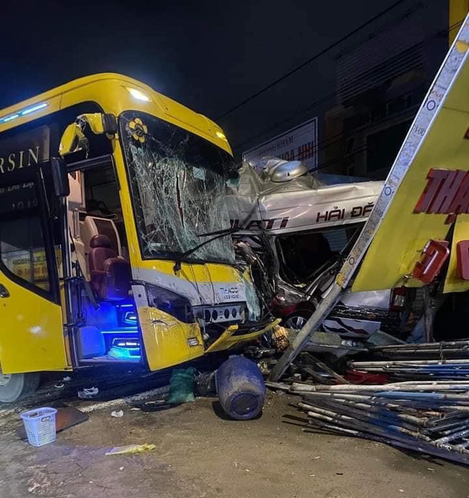 Phần đầu của xe khách biển số 50F-004.83 biến dạng nghiệm trọng. Ảnh: N.T