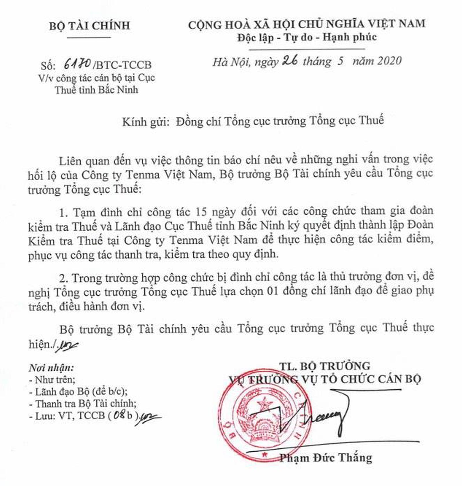 Tại Công văn số 6170, Bộ trưởng Bộ Tài chính yêu cầu Tổng cục trưởng Tổng cục Thuế tạm đình chỉ công tác 15 ngày đối với các công chức tham gia đoàn kiểm tra Thuế và lãnh đạo Cục Thuế tỉnh Bắc Ninh ký quyết định thành lập đoàn kiểm tra thuế tại Công ty Tenma Việt Nam để thực hiện công tác kiểm điểm, phục vụ công tác thanh tra, kiểm tra theo quy định.