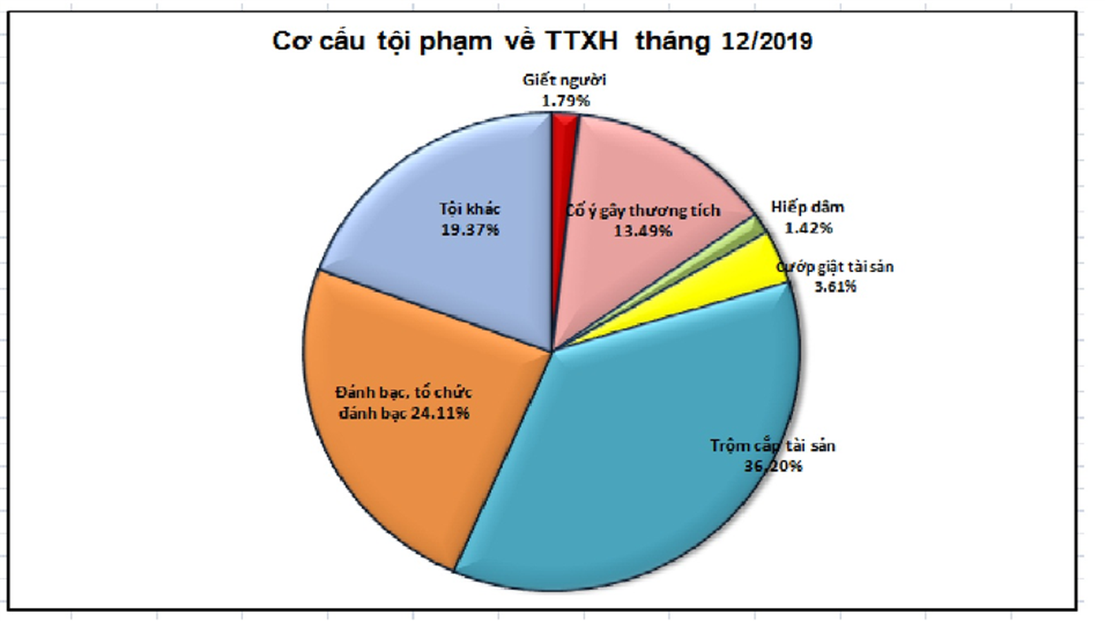 Vi phạm pháp luật về trật tự xã hội: Toàn quốc xảy ra 4.351 vụ; khám phá 3.750 vụ; bắt giữ, xử lý 8.668 đối tượng; tỷ lệ khám phá đạt 86,19%; triệt phá 152 băng, nhóm. So với tháng 12/2019, tăng 677 vụ (+18,43%), tăng 812 số vụ khám phá (+27,64%), tăng 3.767 số đối tượng bị bắt giữ, xử lý (+76,86%). Tỷ lệ khám phá tăng; tăng 53 số băng, nhóm bị triệt phá (+53,54%). Biểu đồ tội phạm và vi phạm pháp luật về trật tự xã hội tháng 01/2020. Vi phạm pháp luật về trật tự quản lý kinh tế: Toàn quốc xảy ra 1.835 vụ, so với tháng 12/2019 tăng 1.182 vụ (+181,01%). Vi phạm pháp luật về môi trường: Toàn quốc xảy ra 513 vụ, so với tháng 12/2019 tăng 376 vụ (+274,45%). Vi phạm pháp luật về ma túy: Toàn quốc xảy ra 3.743 vụ, so với tháng 12/2019 tăng 2.682 vụ (+252,78%). Công tác truy nã: Toàn quốc đã bắt, vận động đầu thú, thanh loại 636 đối tượng truy nã, 143 đối tượng nguy hiểm và đặc biệt nguy hiểm. So với tháng 12/2019, số đối tượng truy nã bị bắt tăng 312 đối tượng (+96,30%), số đối tượng nguy hiểm và đặc biệt nguy hiểm bị bắt tăng 67 đối tượng (+88,16%).