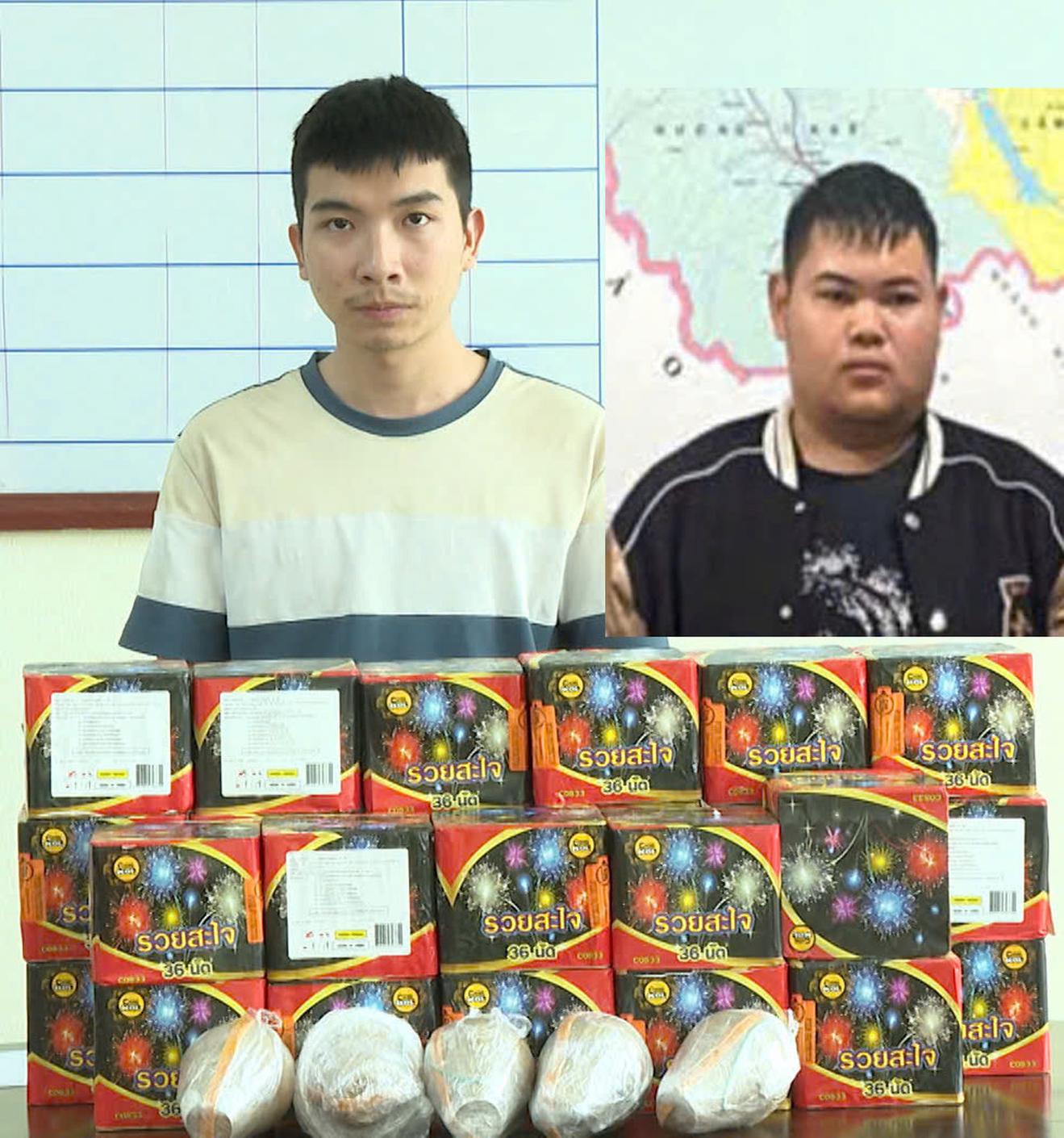 Đối tượng Nguyễn Văn Hai (trái) và Đỗ Minh Trí cùng số pháo thu giữ. Ảnh: Công an Thanh Hoá