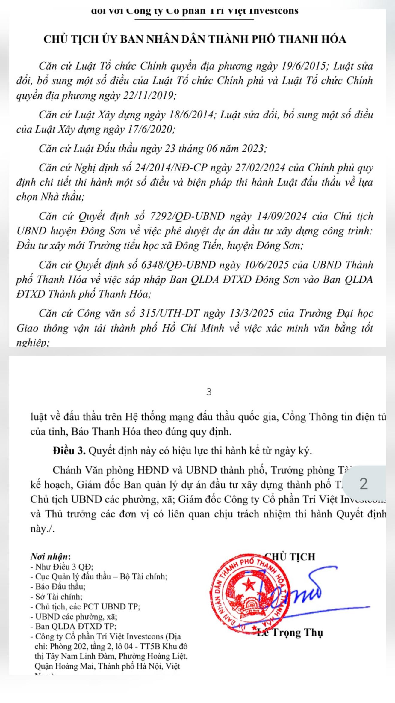 Theo đó, nhà thầu này đã có hành vi gian lận trong đấu thầu, cụ thể là sử dụng văn bằng không hợp pháp của nhân sự chủ chốt để tham dự gói thầu số 05: Thi công xây dựng công trình: Tiểu dự án GPMB Đường từ nút giao Đông Xuân đi thành phố Thanh Hóa đoạn Đông Thanh – Đông Tiến – Hạng mục: Đầu tư xây mới Trường tiểu học xã Đông Tiến, huyện Đông Sơn (Vi phạm quy định tại khoản 4 Điều 16 Luật Đấu thầu số 22/2023 và bị xử lý theo điểm a khoản 1 Điều 125 Nghị định 24/2024/NĐ-CP).