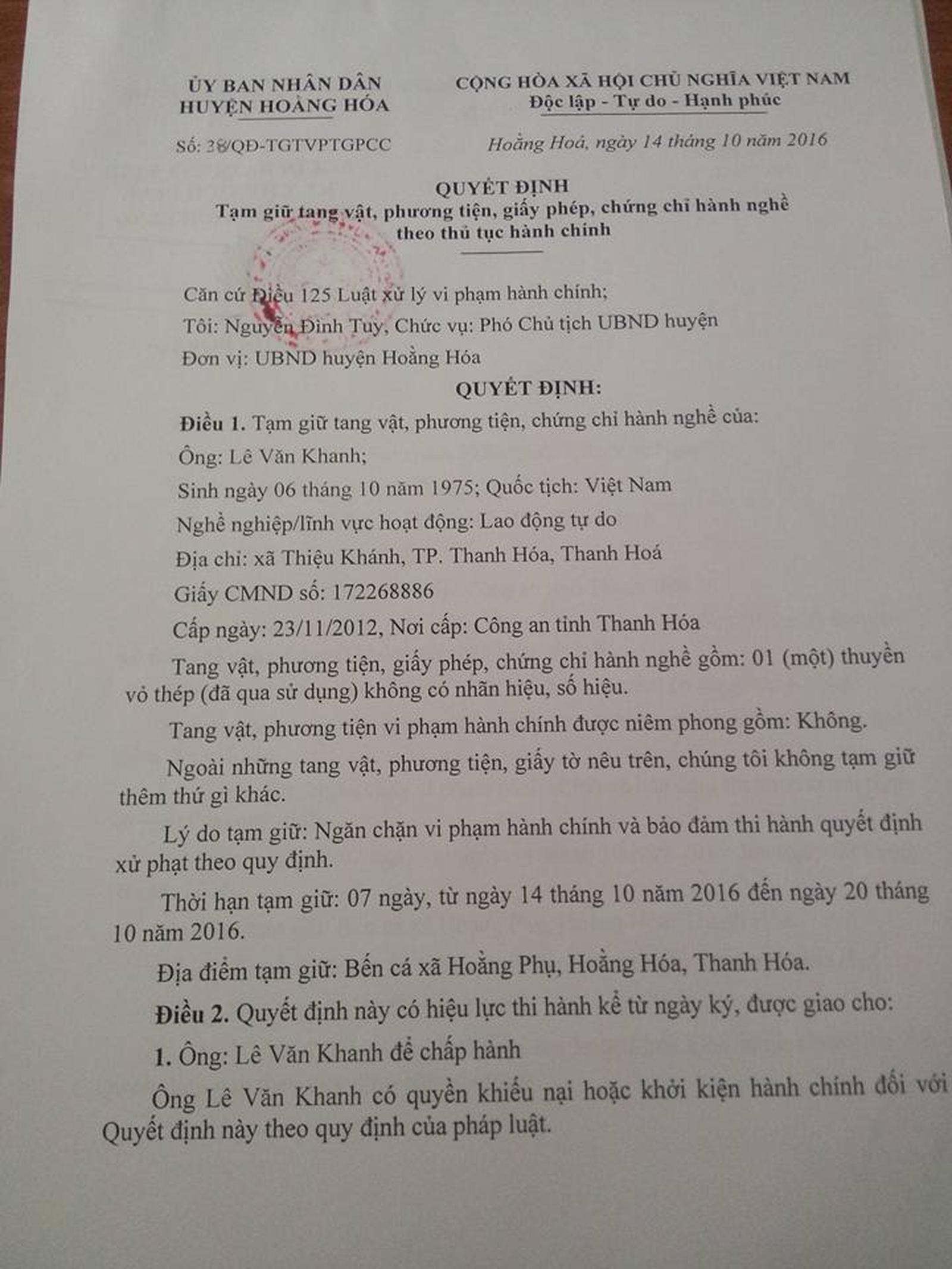 Quyết định tạm giữ các tàu khai thác cát vi phạm ở xã Hoằng Giang. Ảnh: Văn Thanh