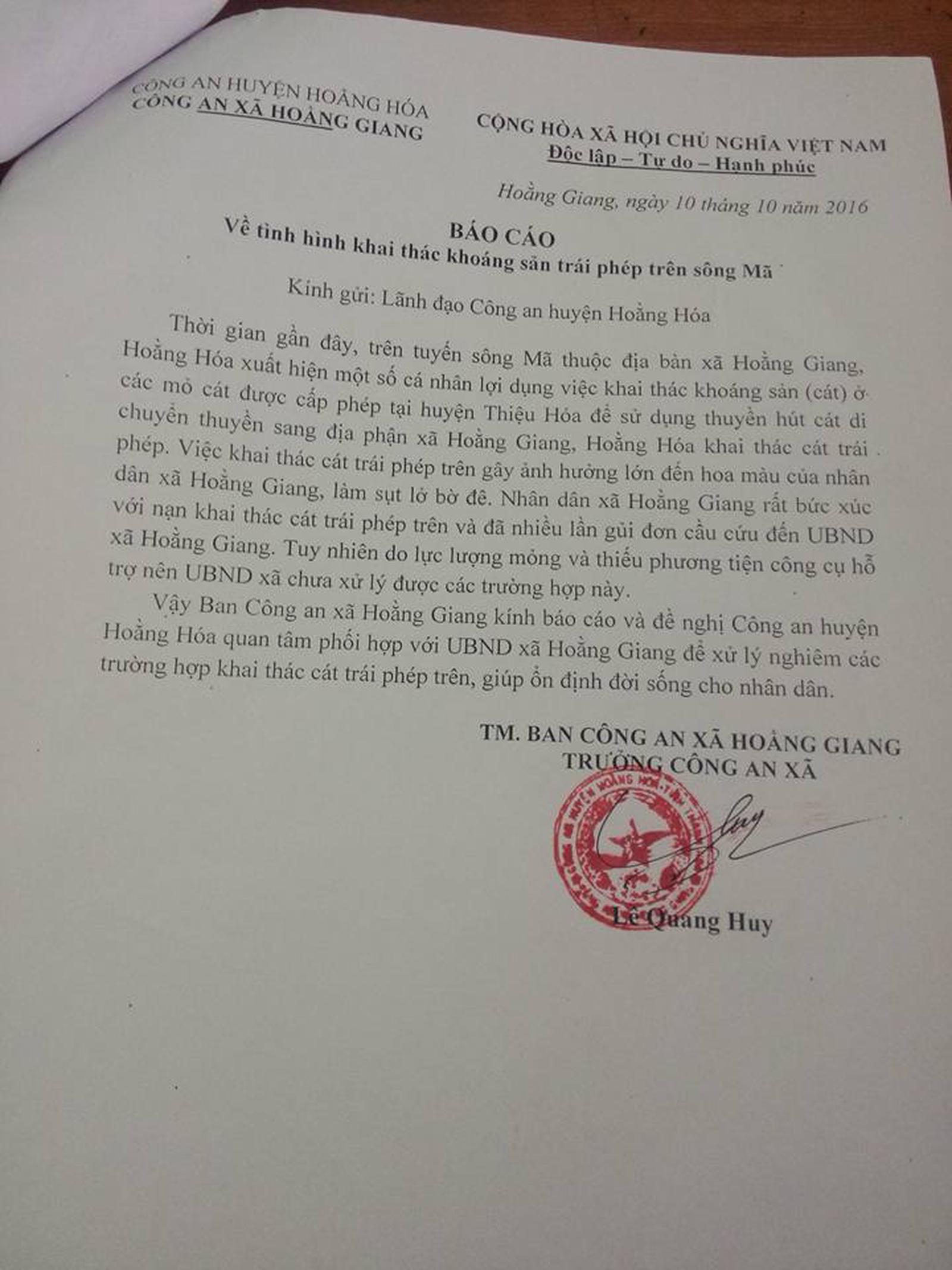 Báo cáo của Công an xã Hoằng Giang về tình hình cát tặc trên địa bàn. Ảnh: Văn Thanh