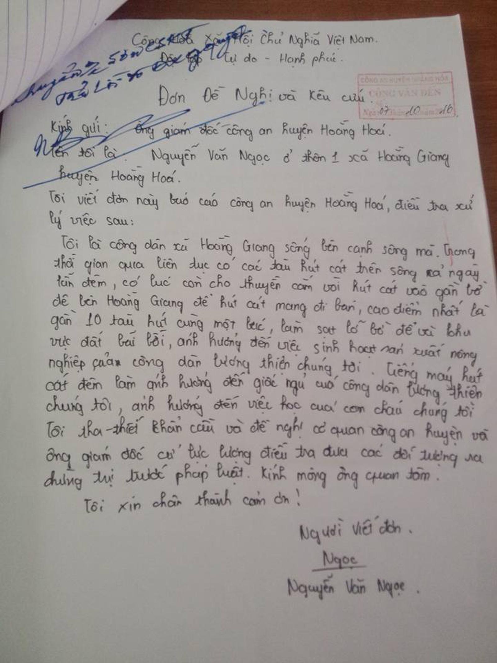 Nhiều người dân đã làm đơn kiến nghị đến các ban, ngành chức năng, Công an huyện Hoằng Hóa đề nghị vào cuộc xử lý nghiêm minh nạn cát tặc.