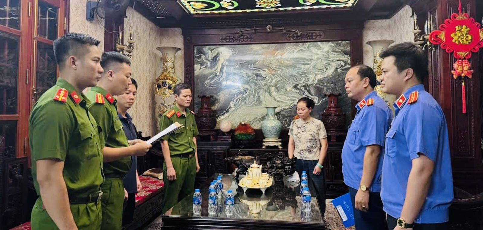 Cơ quan chức năng đọc lệnh Quyết định phê chuẩn lệnh khám xét nơi ở và nơi làm việc của các đối tượng bị can. Ảnh: Công an Thanh Hoá