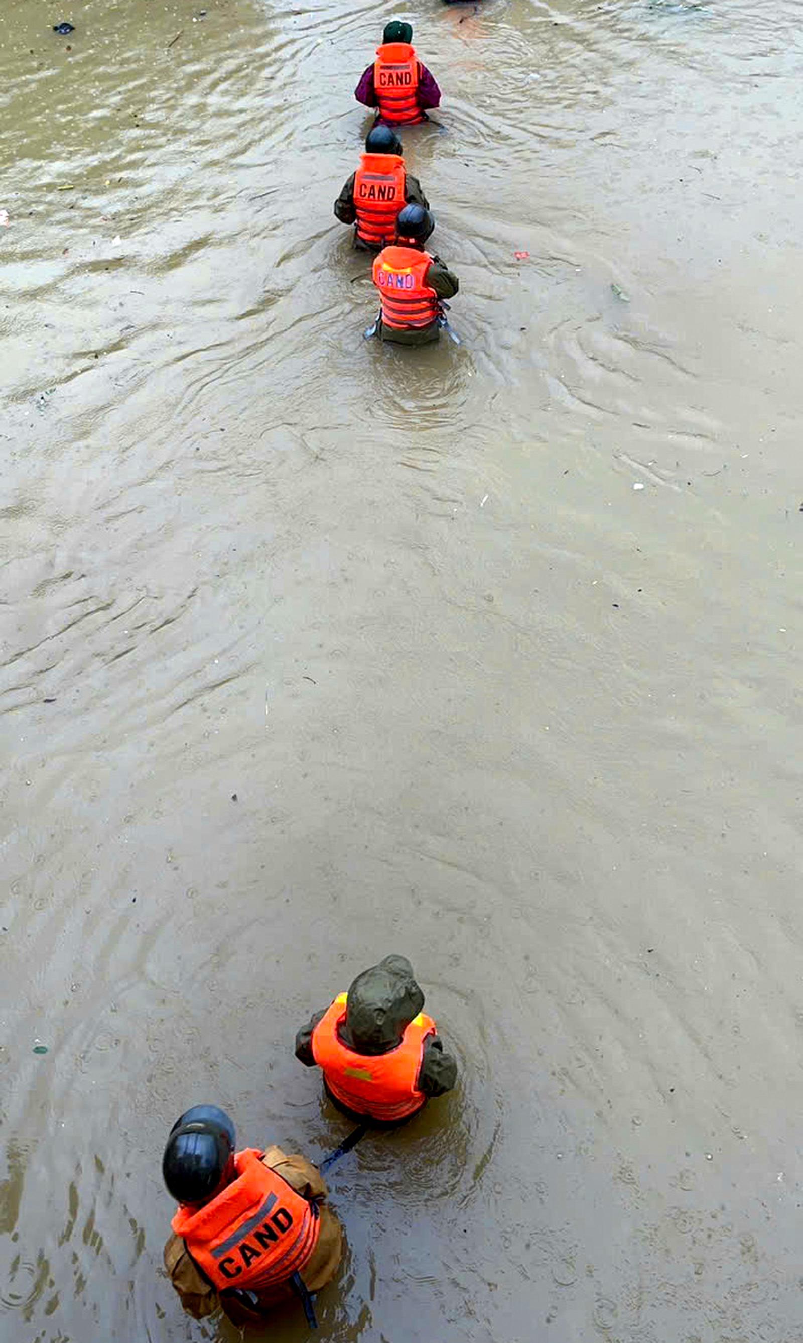 Tại các điểm ngập sâu, lực lượng công an thiết lập chốt kiểm soát, hướng dẫn người và phương tiện di chuyển an toàn, kiên quyết không để qua lại vùng nước chảy xiết, đồng thời tổ chức cứu trợ, hỗ trợ hậu cần, đảm bảo không ai bị bỏ lại phía sau, không ai bị đói rét hay thiếu nơi ở sau thiên tai.