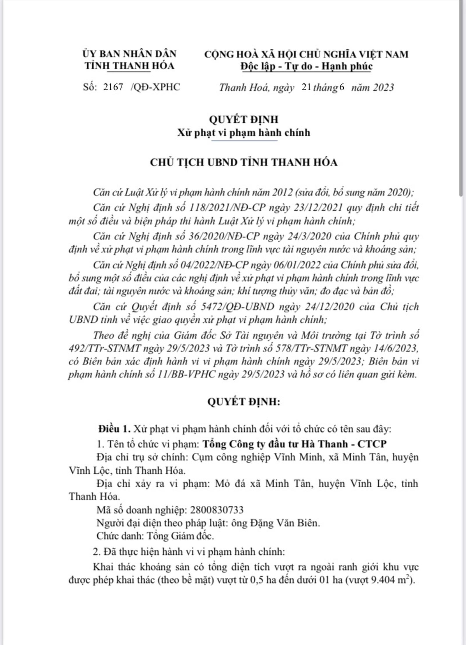 Tổng Cty Hà Thanh có trụ sở chính tại Cụm Công nghiệp Vĩnh Minh, xã Minh Tân, huyện Vĩnh Lộc, tỉnh Thanh Hoá đã khai thác khoáng sản vượt ra ngoài ranh giới khu vực được phép khai thác 9.404m2 theo quy định tại điểm b, khoản 5, Điều 37 Nghị định số 36/2020/NĐ-CP của Chính phủ quy định về xử phạt vi phạm hành chính trong lĩnh vực tài nguyên nước và khoáng sản; được sửa đổi, bổ sung tại khoản 15, Điều 2 Nghị định số 04/2022/NĐ- CP của Chính phủ sửa đổi, bổ sung một số điều của các nghị định về xử phạt vi phạm hành chính trong lĩnh vực đất đai; tài nguyên nước và khoáng sản; khí tượng thuỷ văn; đo đạc và bản đồ.