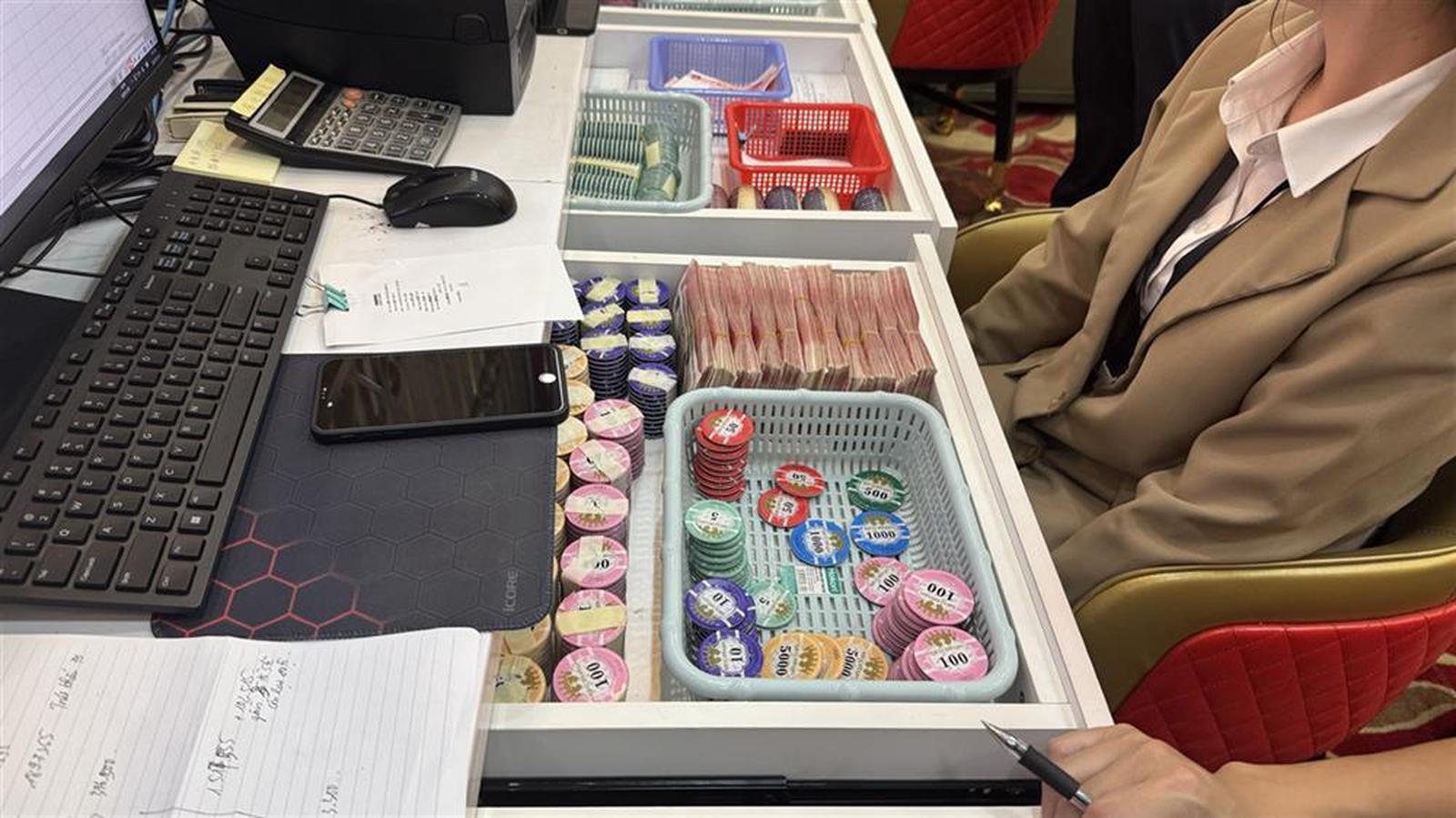 Tang vật thu giữ tại hiện trường gồm tiền Nhân dân tệ và phỉnh, quy đổi trị giá khoảng 720 tỷ đồng tiền Việt Nam; 50 bộ bài lá, 30 bộ máy tính, 12 màn hình, 90 chiếc điện thoại di động cùng nhiều phương tiện khác phục vụ hoạt động phạm tội.