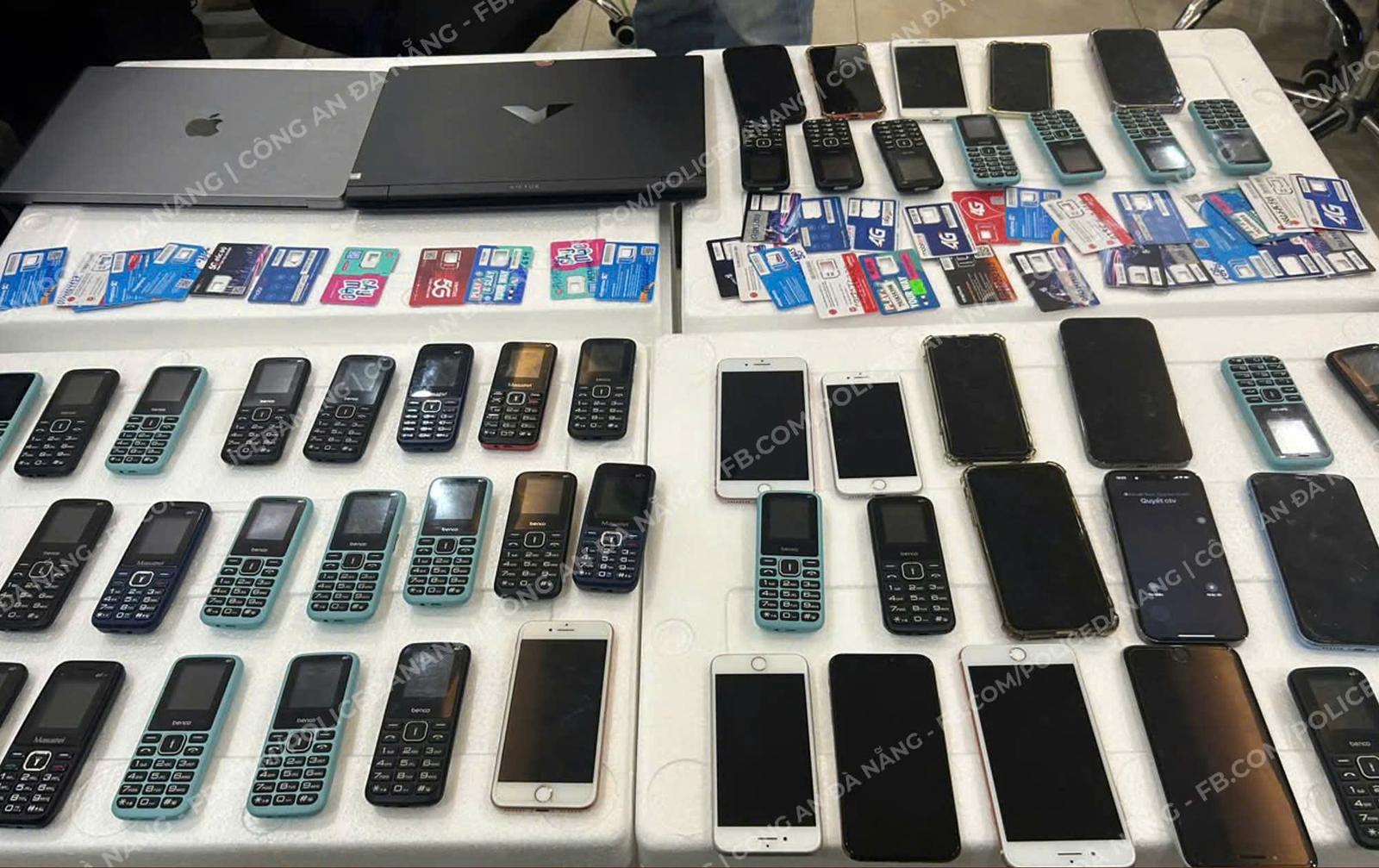 Tang vật thu giữ gồm nhiều iPhone, Macbook, sim điện thoại và chứng cứ liên quan. Ảnh: CA Đà Nẵng