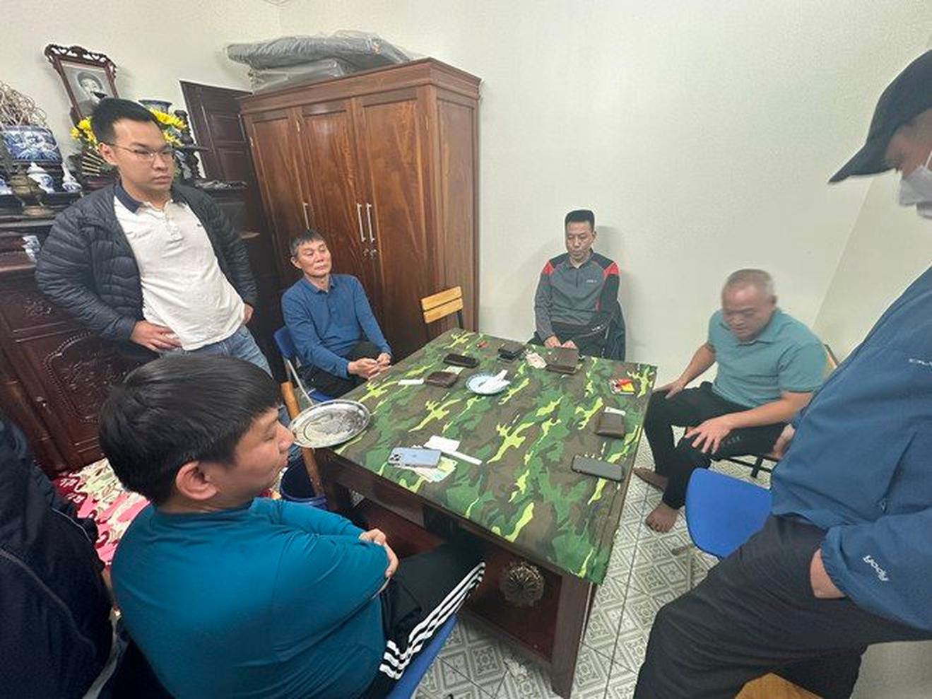 Bước đầu xác nhận, Phạm Thắng Lợi là chủ nhà và chơi đánh bạc với số tiền hơn 19 triệu đồng; Lê Đình Cường, chơi đánh bạc với số tiền hơn 23 triệu đồng; Đoàn Thanh Xuân (ở quận Hà Đông, Hà Đông, Hà Nội) đánh bạc với số tiền gần 30 triệu đồng; Phạm Quốc Sự (ở quận Hà Đông, Hà Nội) đánh bạc với số tiền 15 triệu đồng và Nguyễn Mạnh Vỹ (ở quận Hà Đông, Hà Nội) làm nhiệm vụ chia bài được trả “công” 1 triệu đồng.