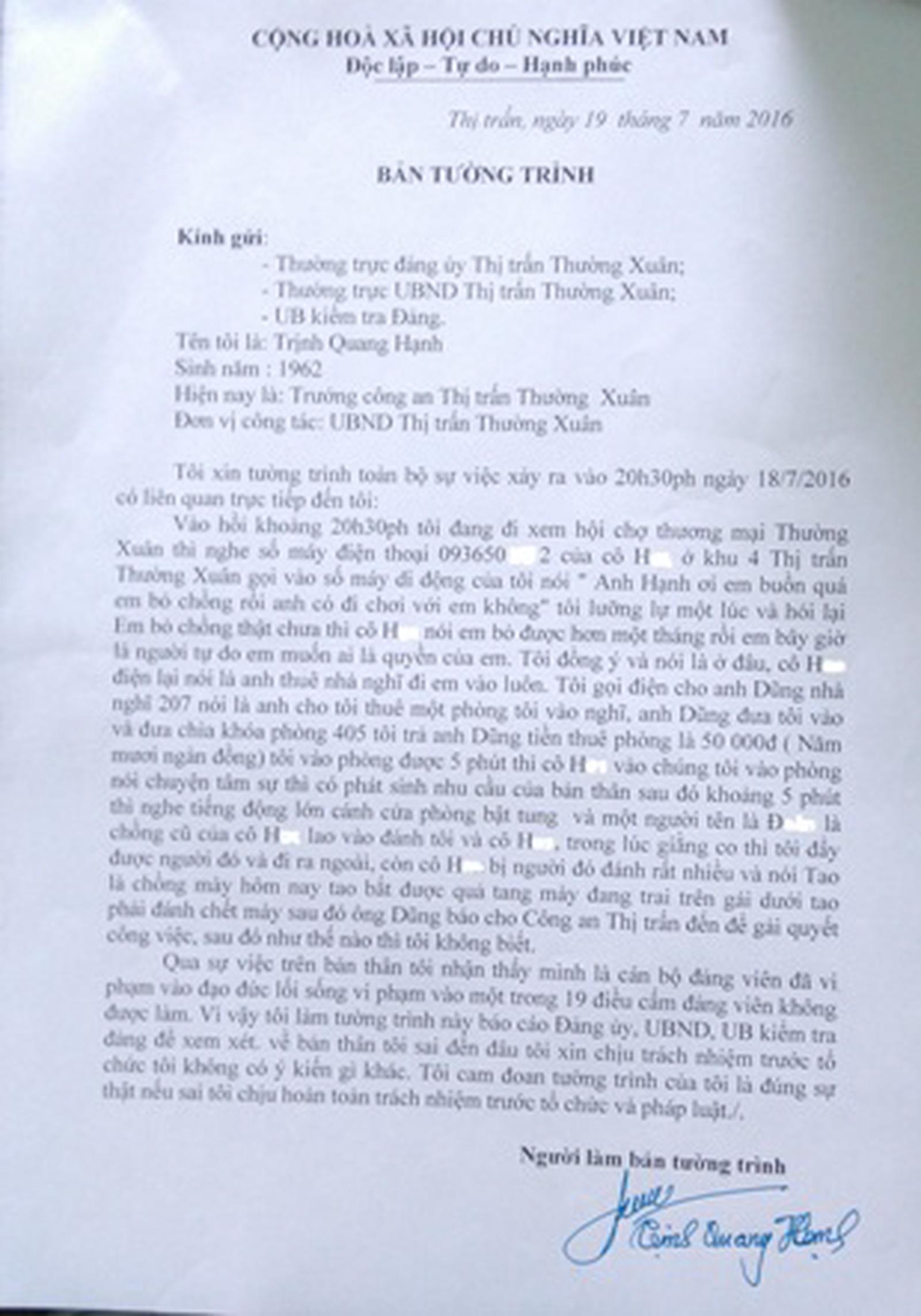 Bản tường trình của Trưởng Công an thị trấn Thường Xuân. Ảnh: Văn Thanh