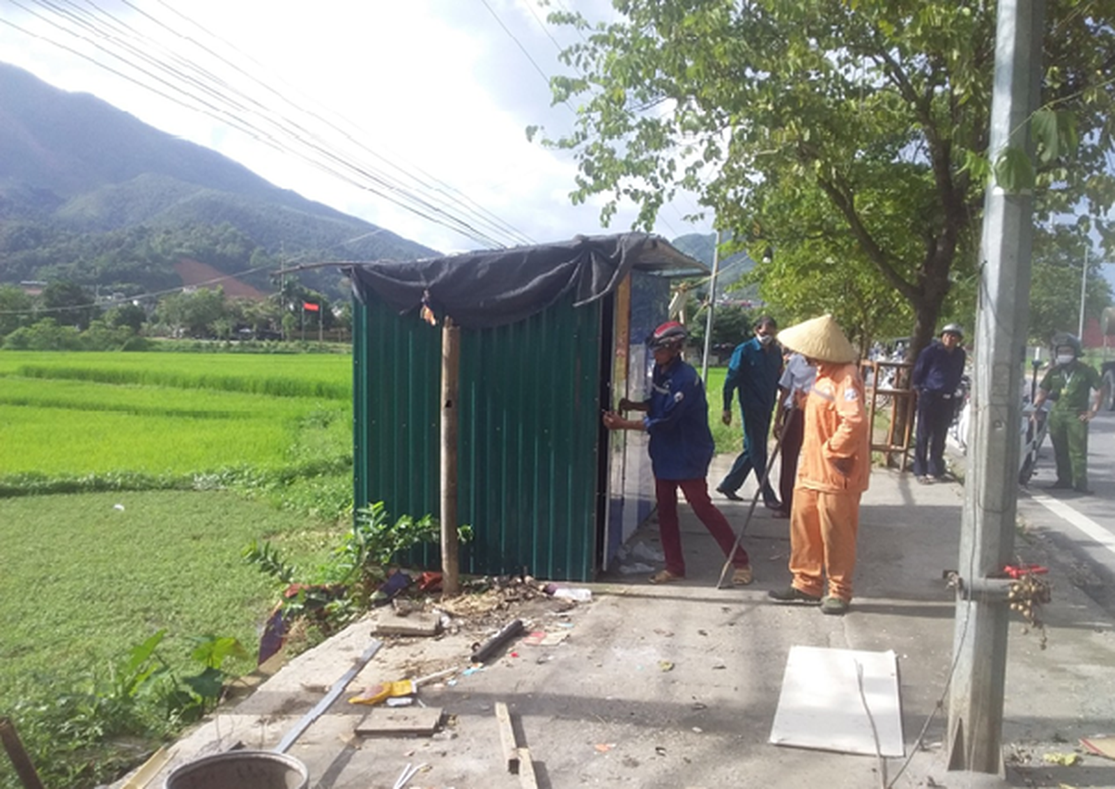 Lực lượng chức năng giải tỏa hành lang an toàn đường bộ. Ảnh: CB