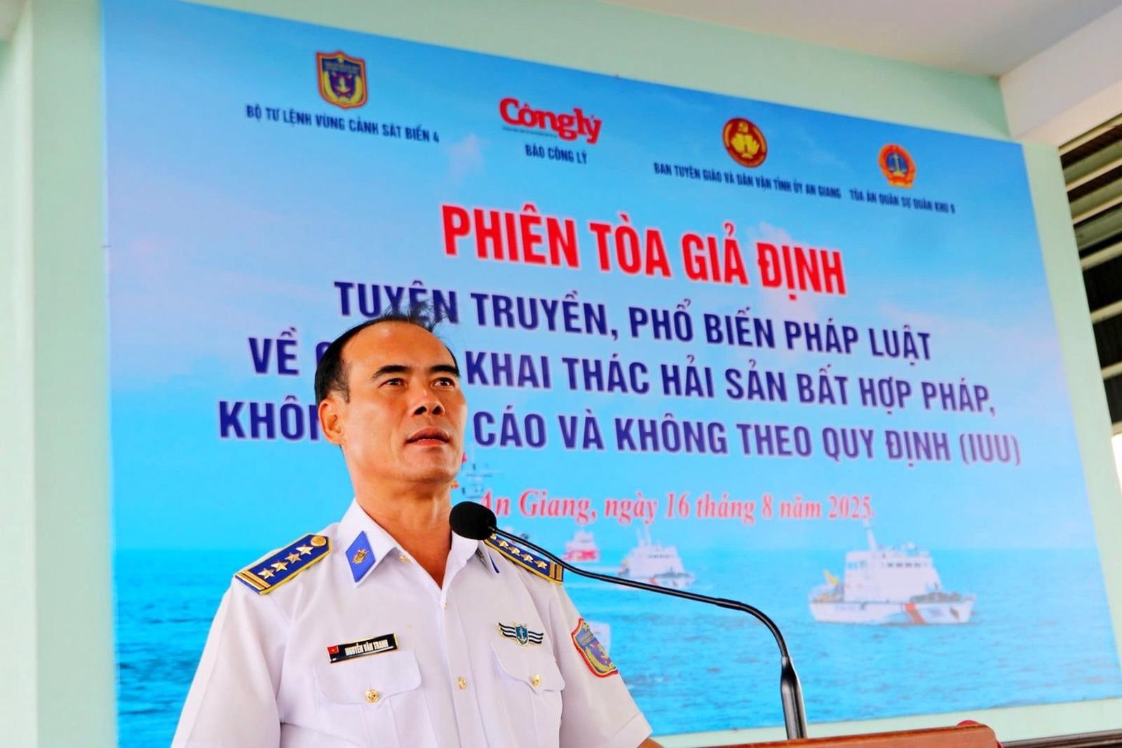 Đại tá Nguyễn Văn Tranh, Phó Tư lệnh Pháp luật, Bộ Tư lệnh Vùng Cảnh sát biển 4 cho biết: “Nhằm góp phần phát triển kinh tế biển bền vững, Bộ Tư lệnh Vùng Cảnh sát biển 4 phối hợp với Tòa án Quân sự Quân khu 9, Báo Công lý tổ chức phiên tòa giả định tuyên truyền, phổ biến pháp luật về chống khai thác IUU.