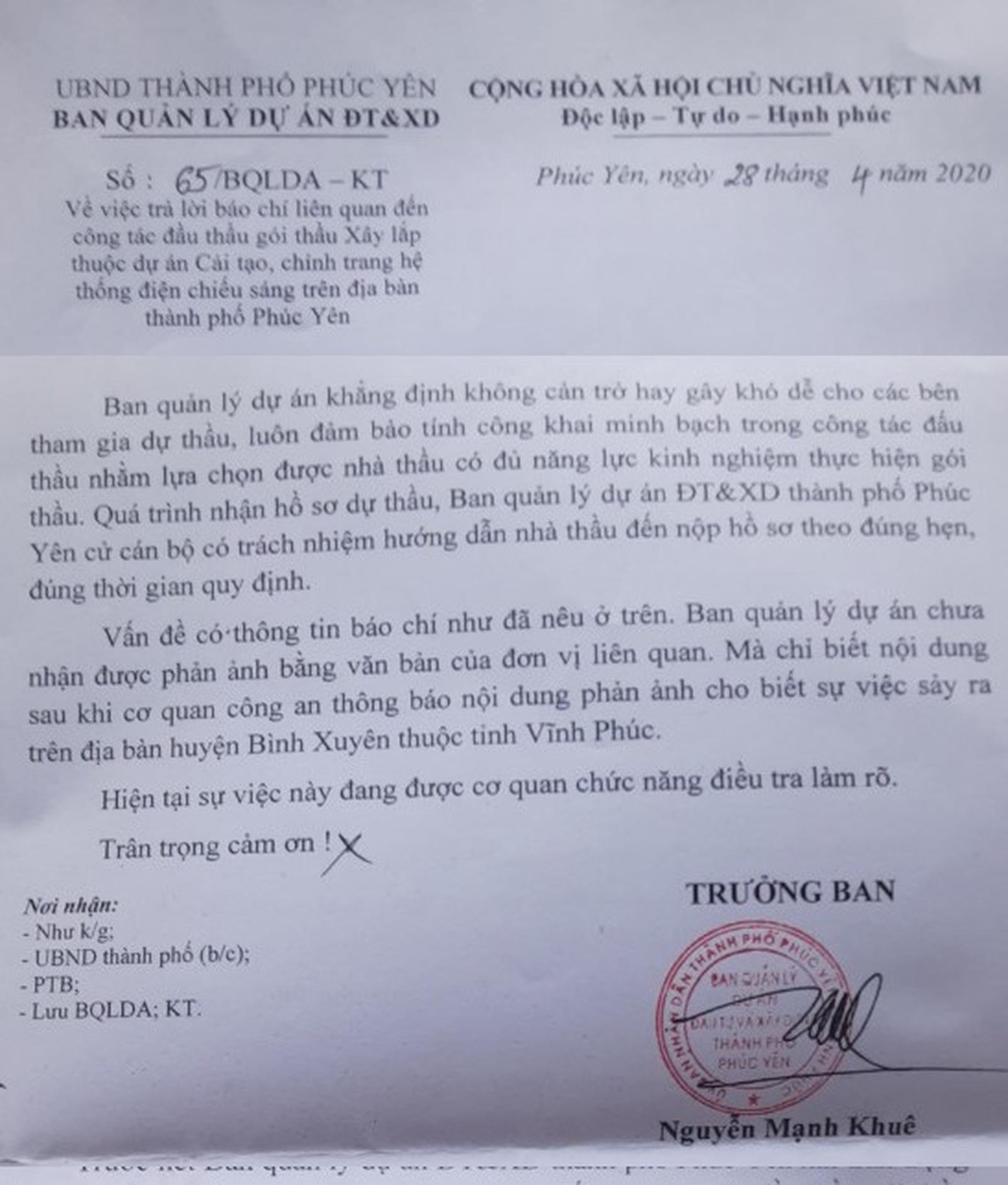 Sau đó, BQLDA Phúc Yên có Công văn số 65, ngày 28/4/2020 trả lời nội dung làm việc của phóng viên Báo Thanh tra, như sau: “Ngày 24/4/2020, trên phương tiện truyền thông có đăng tải nội dung bài viết nhan đề: "Vĩnh Phúc: Hy hữu việc một doanh nghiệp bị cướp hồ sơ trước giờ mở thầu". Sau đó, đến ngày 26/4/2020 tiếp tục xuất hiện bài viết "Cướp hồ sơ dự thầu của doanh nghiệp đi đấu thầu.