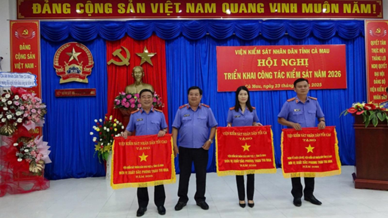 Viện trưởng VKSND tỉnh Cà Mau Đặng Dư Phương trao cờ thi đua cho các tập thể có thành tích xuất sắc trong năm 2025. Ảnh: Cổng TTĐT VKSND tỉnh Cà Mau
