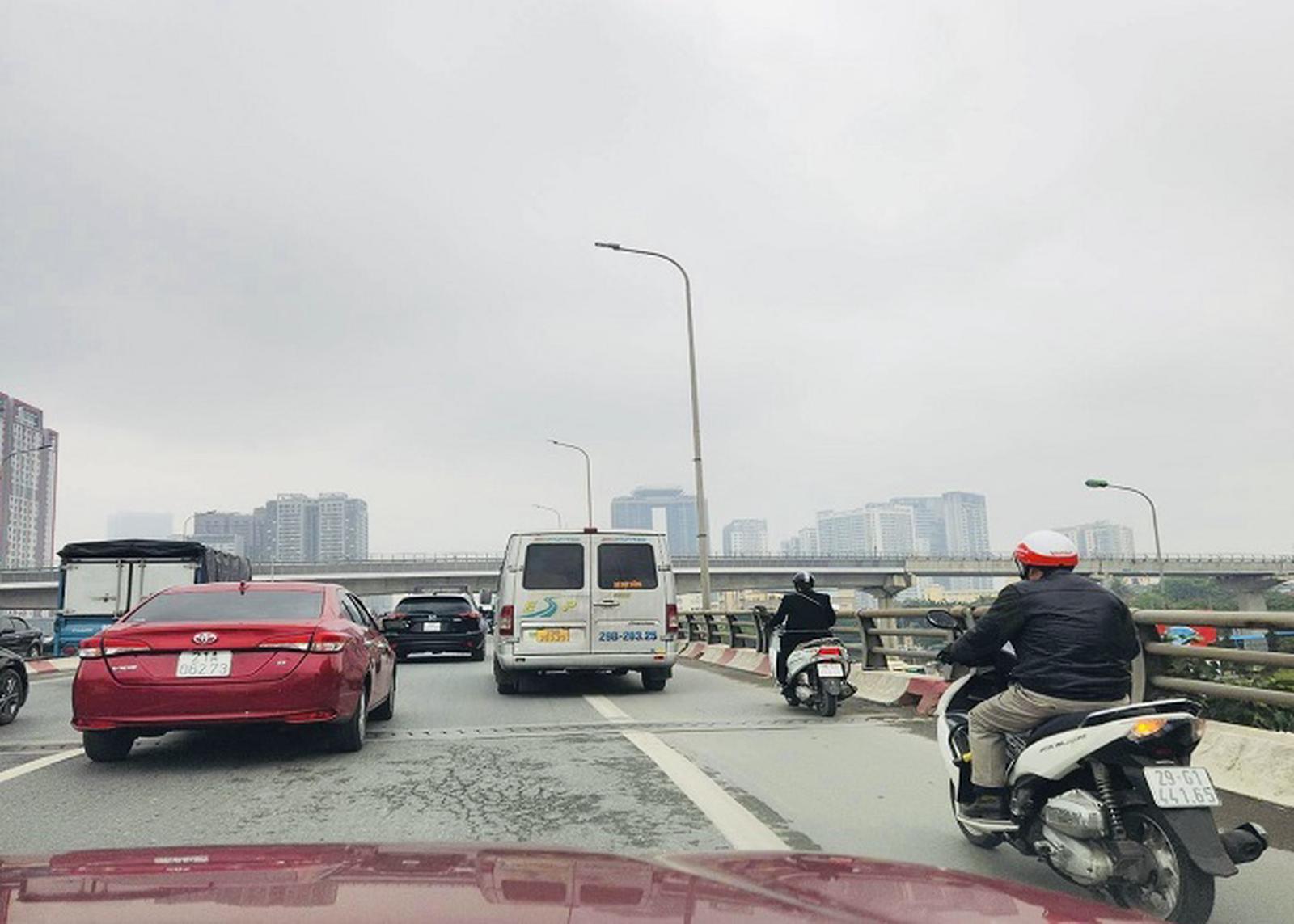 Không những ô tô đi vào làn khẩn cấp mà xe máy cũng "trèo" lên vành đai 3 chạy (ảnh chụp lúc 8h50, ngày 11/1, đoạn cầu Thăng Long - bến xe Mỹ Đình). Ảnh: TQ