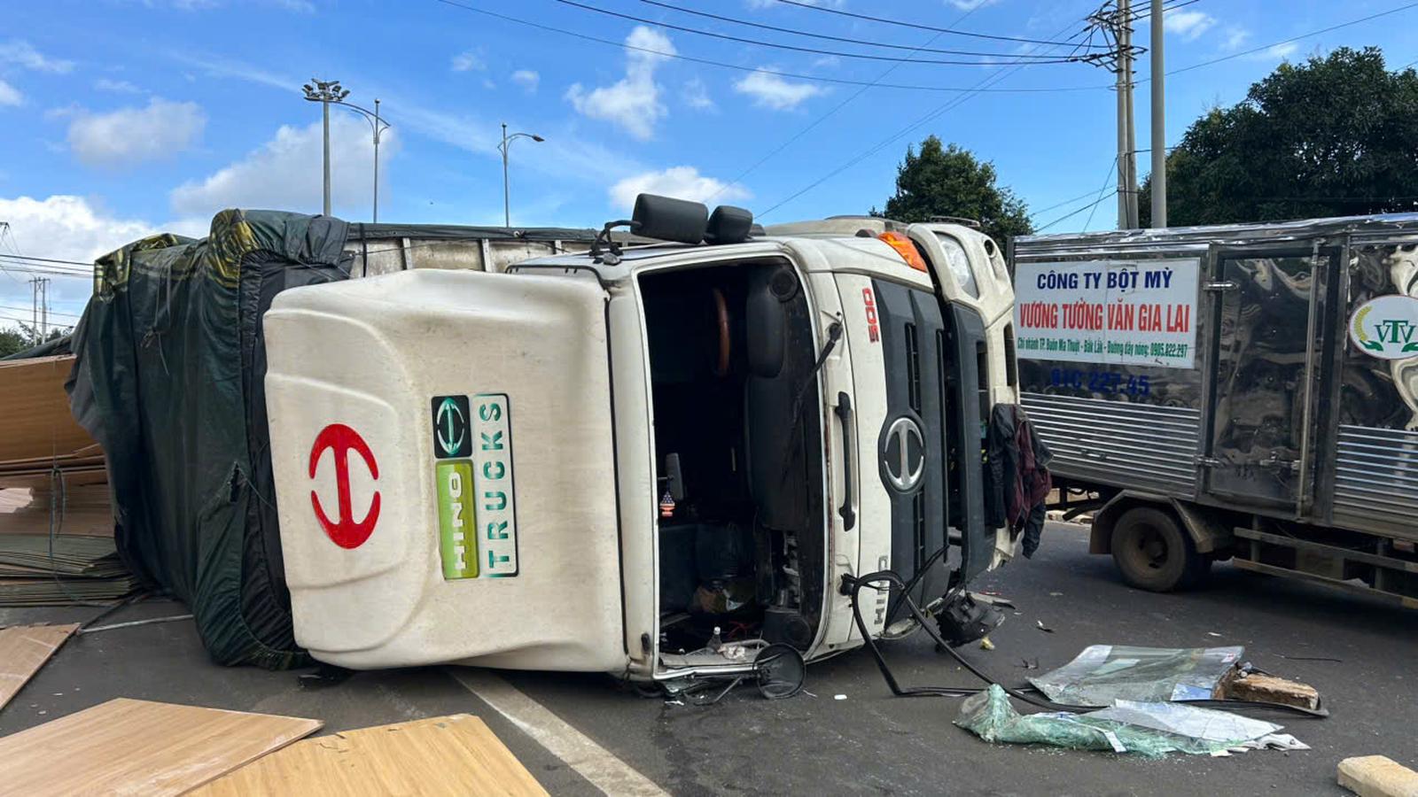 Xe tải lật nhào khi né xe máy ở đường tránh TP Buôn Ma Thuột. Ảnh: VL