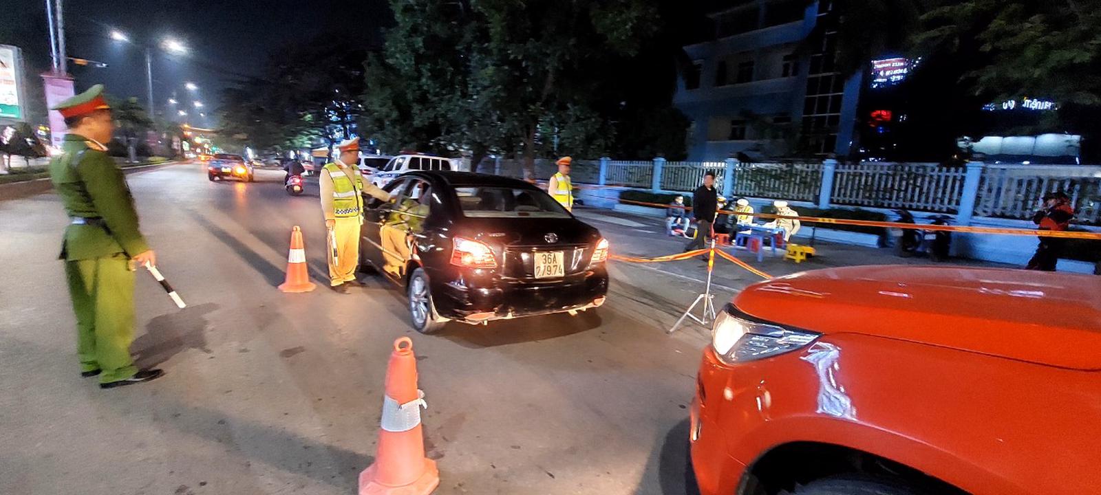 Lực lượng CSGT trật tự, Công an TP Thanh Hóa kiểm tra nồng độ cồn đối với người điều khiển phương tiện tham gia giao thông. Ảnh: VT