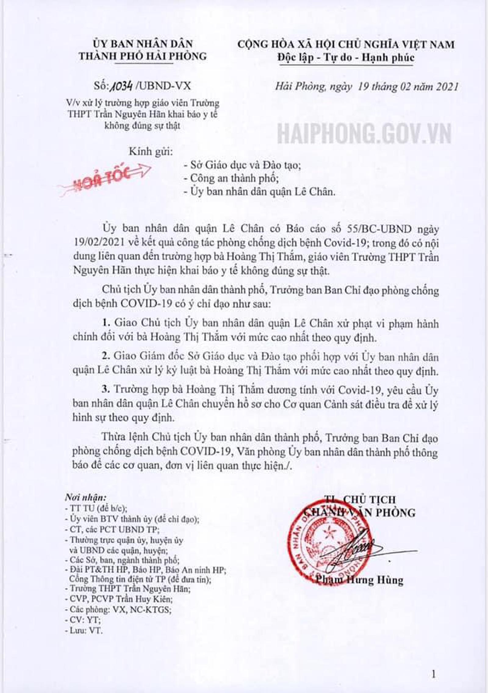 Theo đó, UBND quận Lê Chân có báo cáo về kết quả công tác phòng, chống dịch bệnh COVID-19, trong đó có nội dung liên quan đến trường hợp bà H.T.T, giáo viên Trường THPT Trần Nguyên Hãn thực hiện khai báo y tế không đúng sự thật.
