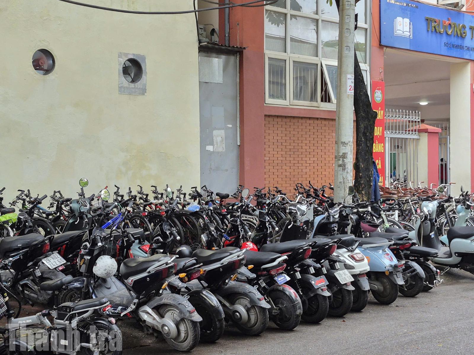 Một điểm trông giữ phương tiện tại phường Hà Đông, Hà Nội với khá nhiều xe do học sinh sử dụng để đến trường không có biển kiểm soát. Ảnh: TM