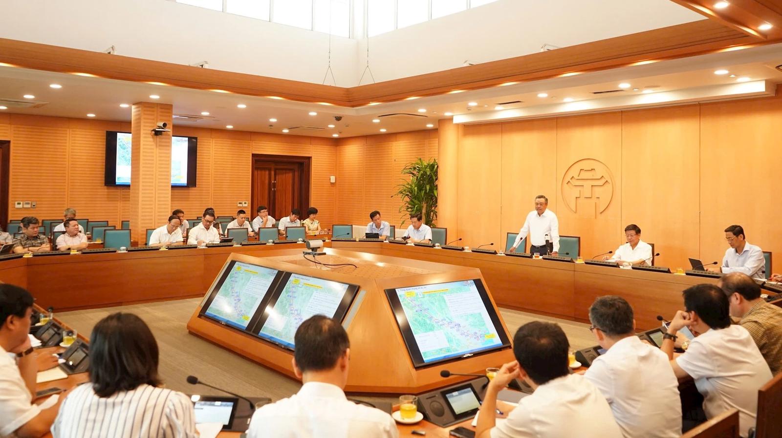 Chủ tịch UBND TP Hà Nội Trần Sỹ Thanh chủ trì họp về tiến độ triển khai GPMB 2 dự án đường sắt Lào Cai - Hà Nội - Hải Phòng và đường sắt tốc độ cao Bắc - Nam (đoạn qua địa bàn Hà Nội). Ảnh: Đình Hiệp