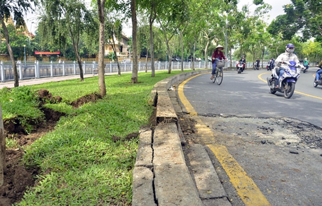 Hố ga phát nổ khiến dải phân cách, mặt đường hư hỏng. Ảnh: Tin Tin.