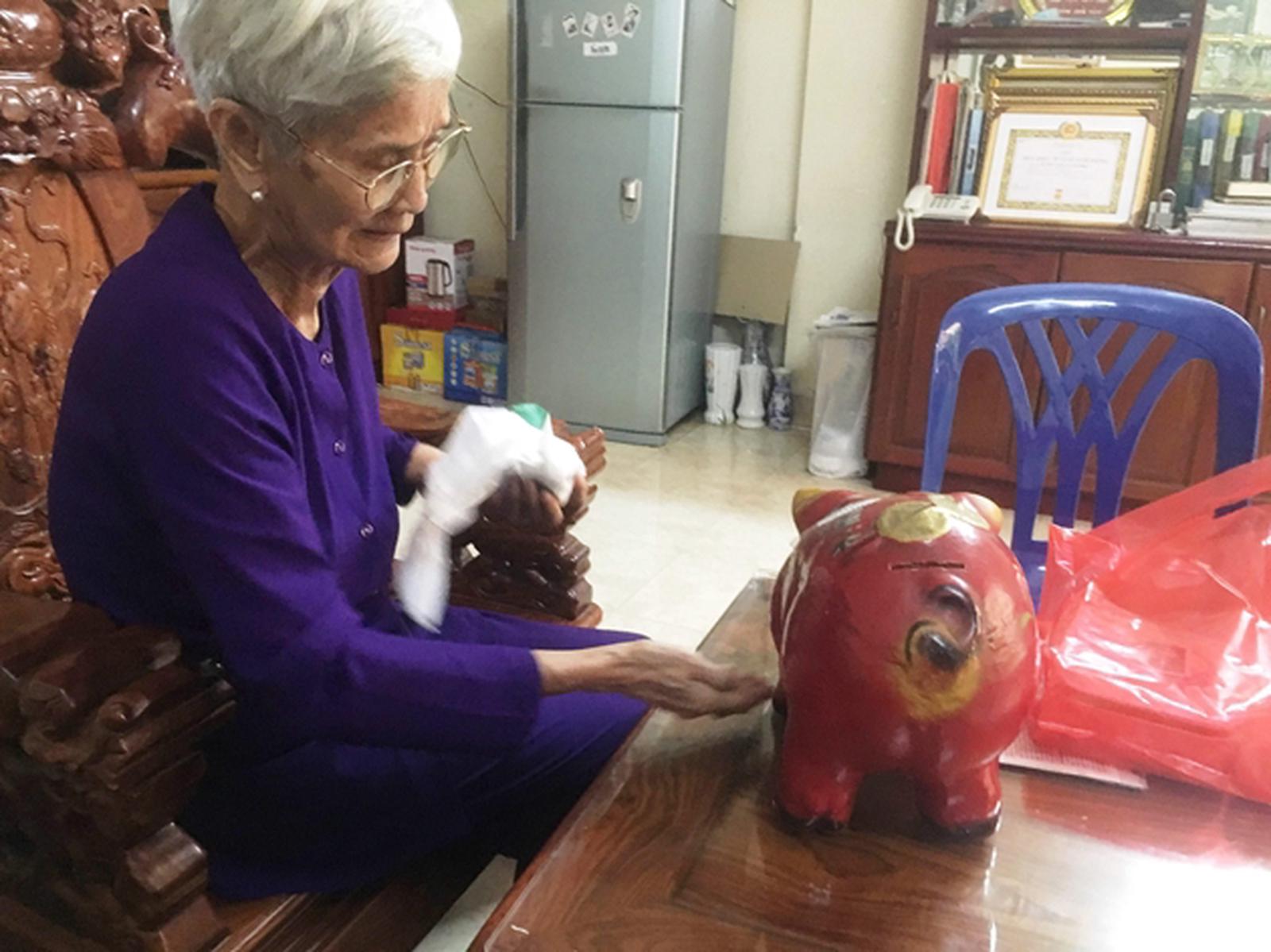 Bà Tâm góp tiền lương hưu, bỏ vào heo đất để giúp đỡ những mảnh đời bất hạnh và các em học sinh nghèo khó. Ảnh: Mai Thắng