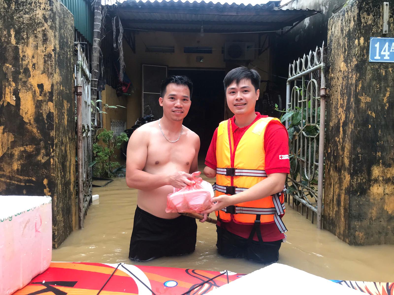 Chàng trai trẻ cùng đội cứu hộ bất kể ngày đêm tiếp tế lương thực cho người dân Thái Nguyên khi bị cô lập vì lũ. Ảnh: NVCC