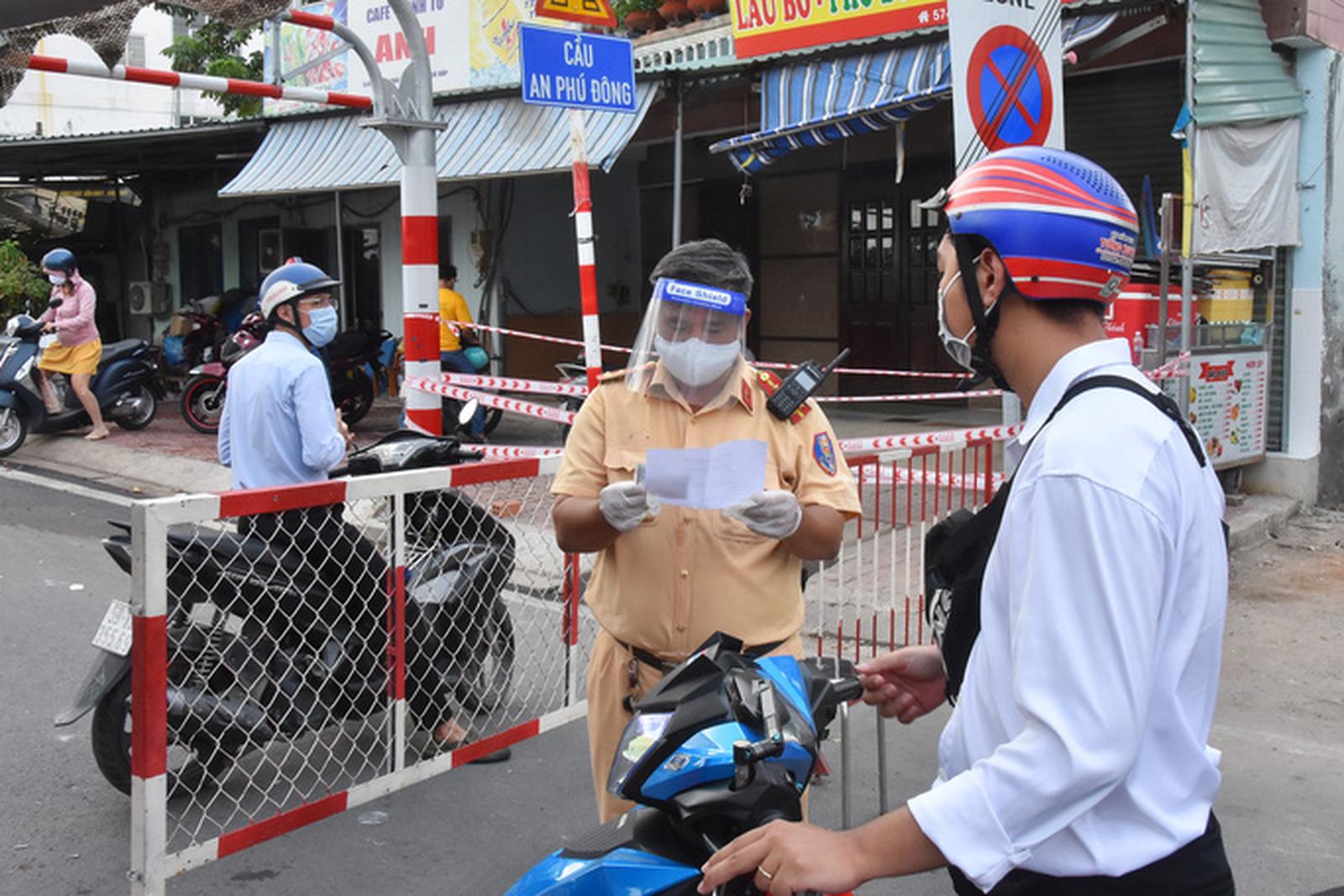 Cảnh sát giao thông kiểm tra giấy tờ người dân khi đi qua chốt cầu An Phú Đông, Gò Vấp. Ảnh: NL